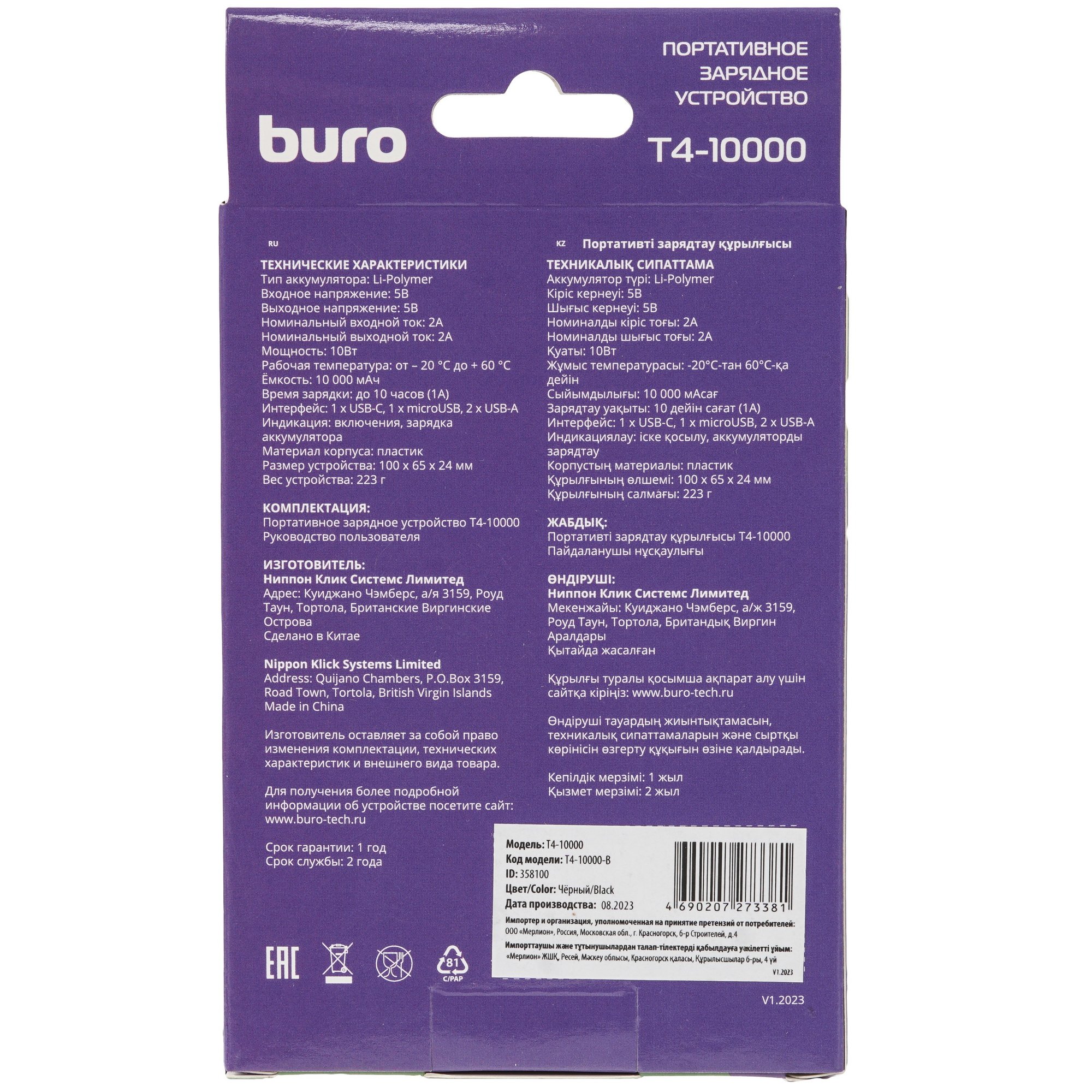 Портативный аккумулятор Buro T4-10000 заключен в пластиковый корпус черного цвета, устойчивый к образованию царапин, трещин и других повреждений. Конфигурацией предусмотрены разъемы USB Type-C, USB Type-A, micro USB. Восполнение энергии самого устройства занимает не менее 10 ч. Емкость достигает 10000 мАч.