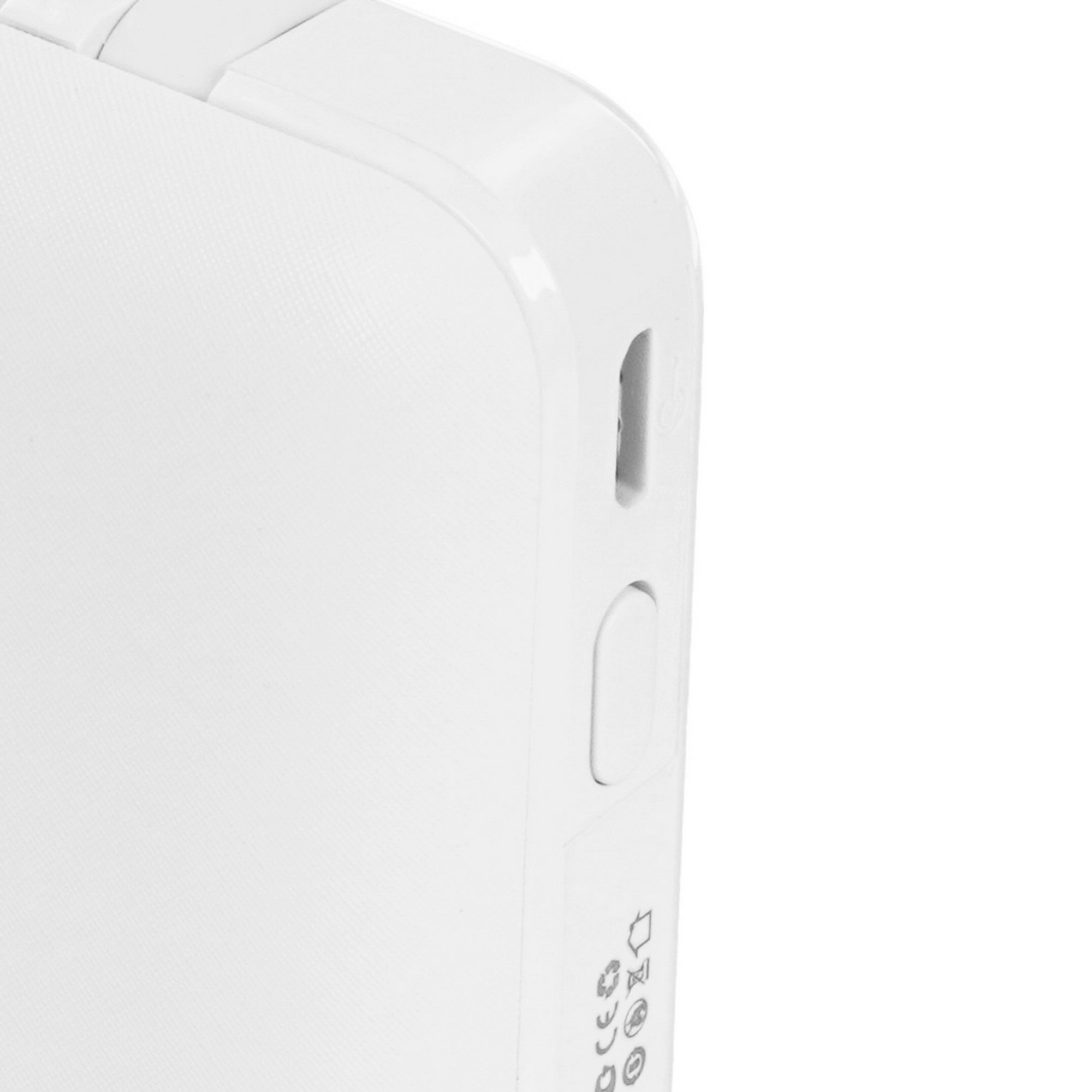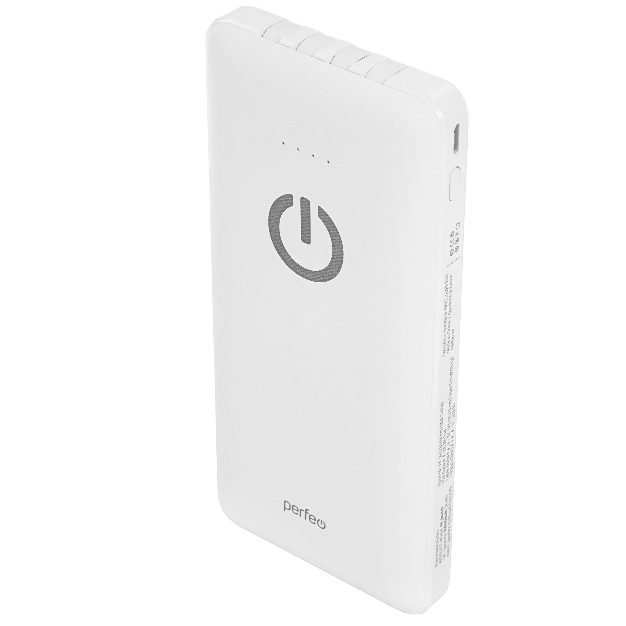 Белый портативный аккумулятор PERFEO Absolute в длину 14.5 см, то есть как 3 спичечных коробка. Это значит, что он поместится в кармане куртки или в отделении для телефона вашей сумки. Корпус выполнен из пластика, поэтому не подвергайте устройству сдавливанию другими предметами, чтобы не повредить. Заряжается аккумулятор через порт micro USB, беспроводная зарядка не предусмотрена в конструкции.