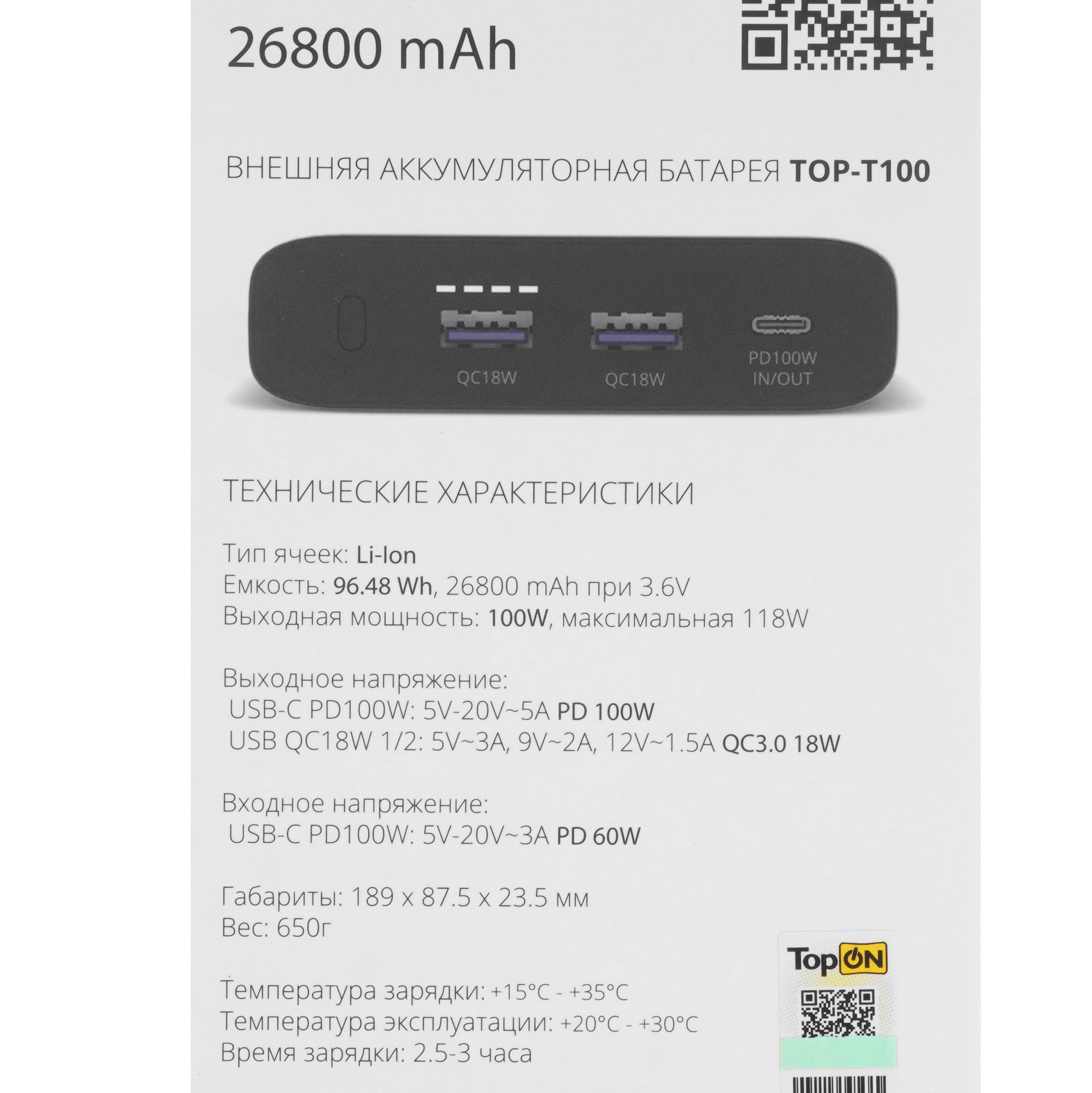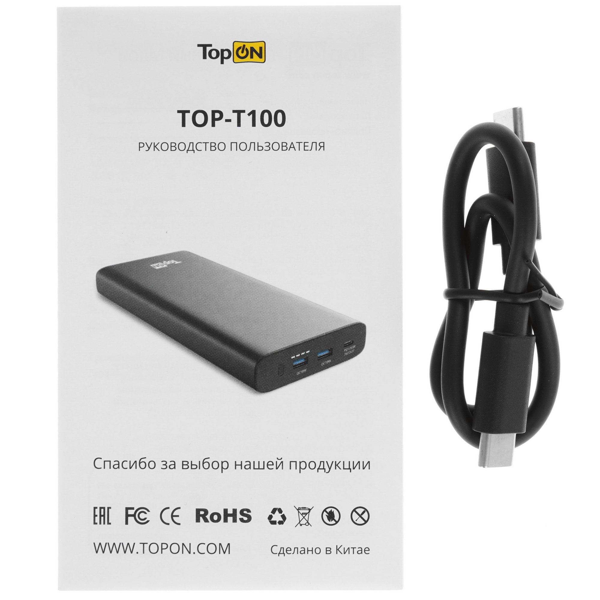 Портативный аккумулятор TopOn TOP-T100 оборудован защитными технологиями, которые исключают риск поломки от перегрева, перепадов напряжения, короткого замыкания. Подзарядка модели занимает не более 3 ч. Вес 650 г позволяет взять аксессуар в поездку, офис, на прогулку.