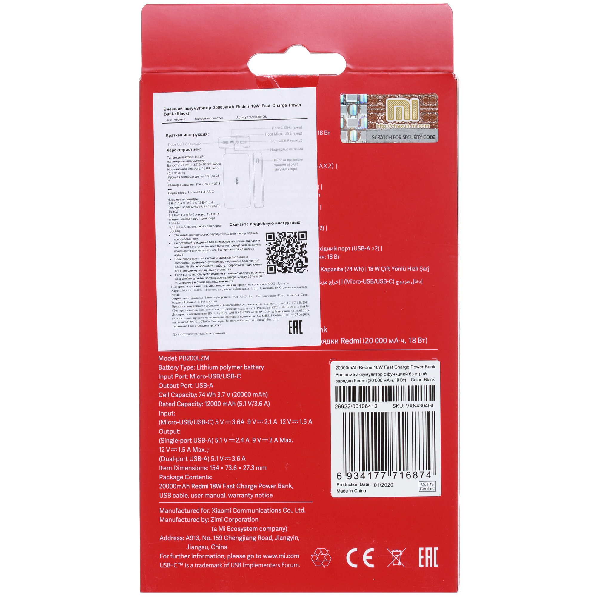 Портативный аккумулятор 20000mAh Xiaomi Redmi 18W Fast Charge Power Bank черный