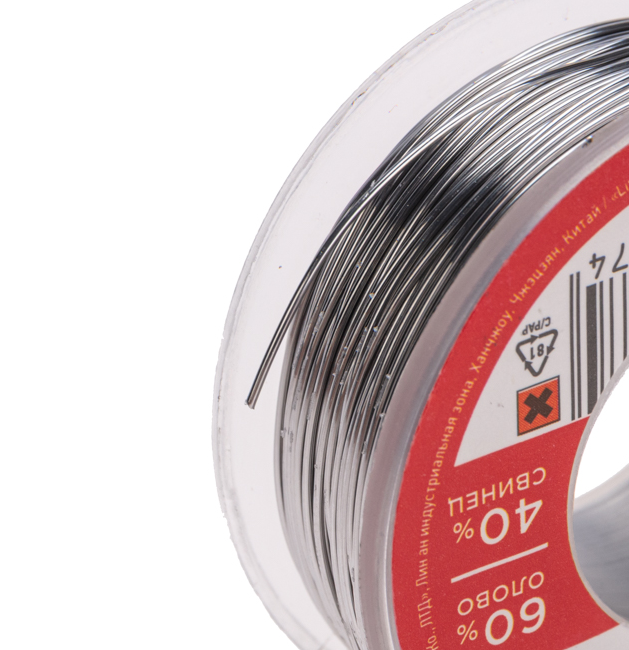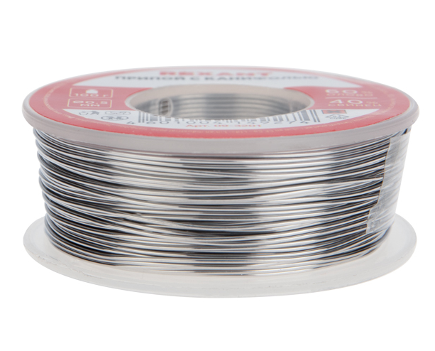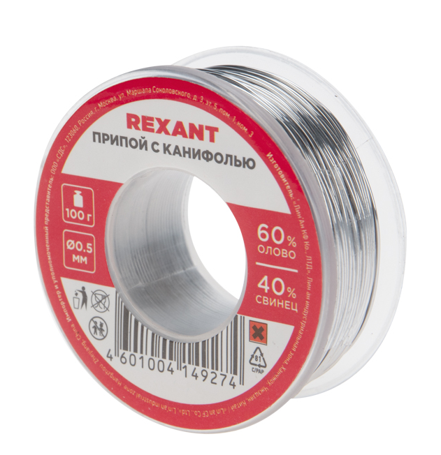 Припой с канифолью REXANT представляет собой проволоку (диаметром 0.5 мм) из сплава олова (60 %) и свинца (40 %). Используется в пайке для соединения деталей между собой и позволяет создать герметичный, механически прочный (устойчивый) шов. Нагреваясь до температуры плавления (183...188 °C) припой: расплавляется, смачивает спаиваемый металл и, растекаясь по нему — заполняет место между соединяемыми деталями.