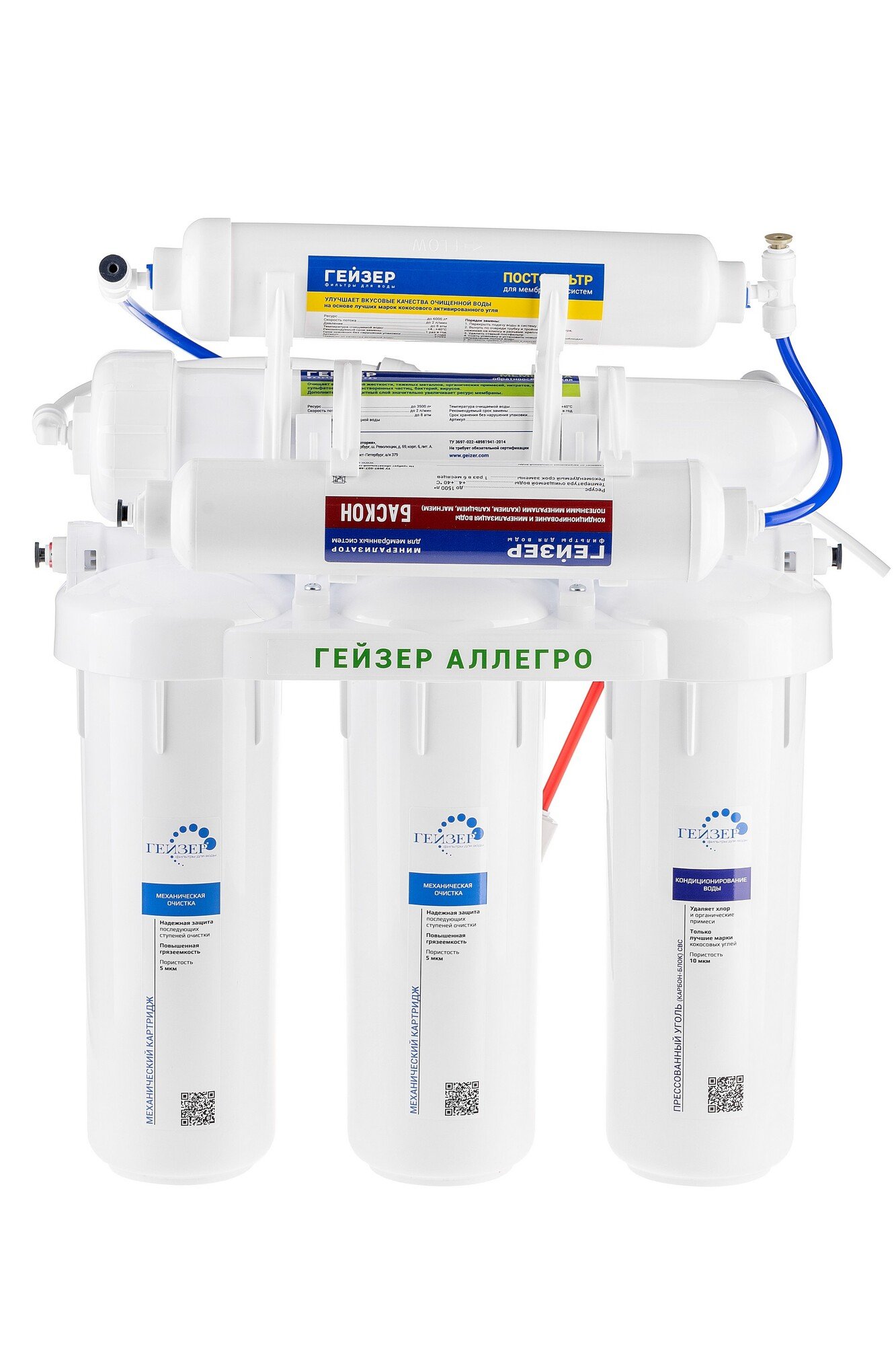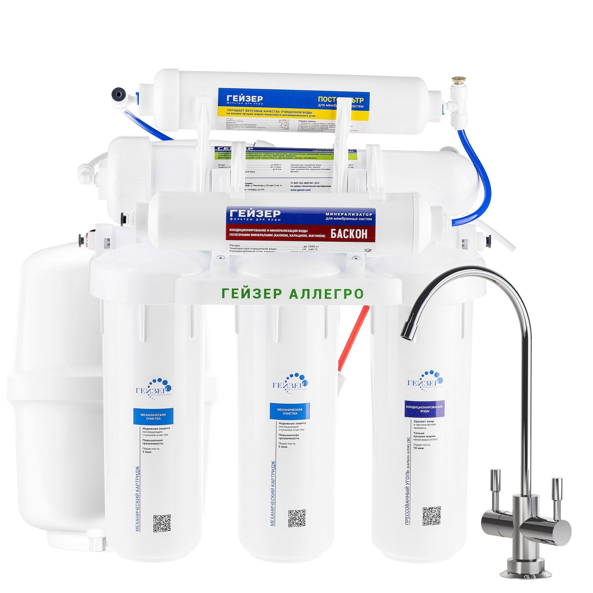 Водоочиститель «Гейзер Аллегро М» с мембраной пористостью 0,0001 микрометра очищает до 200 литров жидкости в сутки с эффективностью 98%. Из воды полностью удаляются соли жесткости и тяжелых металлов, радионуклиды, нитриты, вирусы и бактерии. Защитный слой улучшает смыв фильтрата в дренаж, обеспечивая ресурс мембраны в 1-3 года в зависимости от исходных характеристик жидкости.