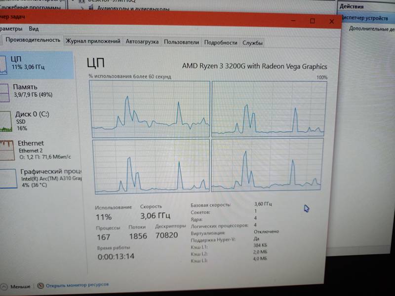 Процессор AMD Ryzen 3 3200G OEM поддерживает технологию виртуализации, за счет чего возможна одновременная работа в разных операционных системах, без их переустановки. Микроархитектура процессора состоит из 4 ядер и выполнена на основе техпроцесса GlobalFoundries 12LP. Это обеспечивает хорошую производительность и низкое энергопотребление. При увеличении нагрузки рабочая частота ядер автоматически повышается с 3.6 до 4 ГГц. Свободный множитель помогает «разогнать» процессор еще сильнее, улучшив тем самым характеристики компьютера.