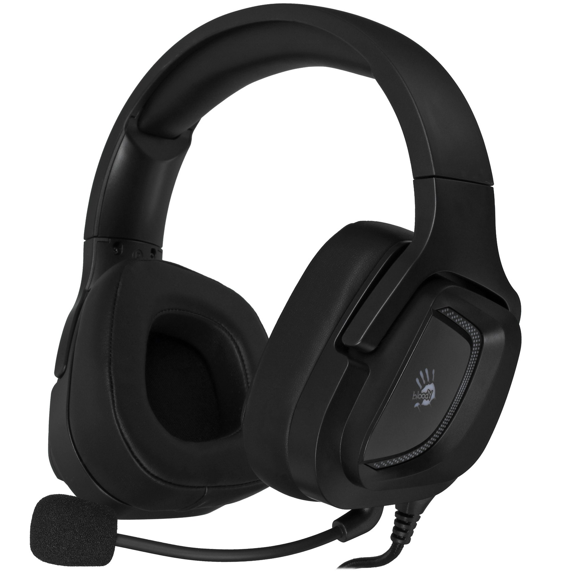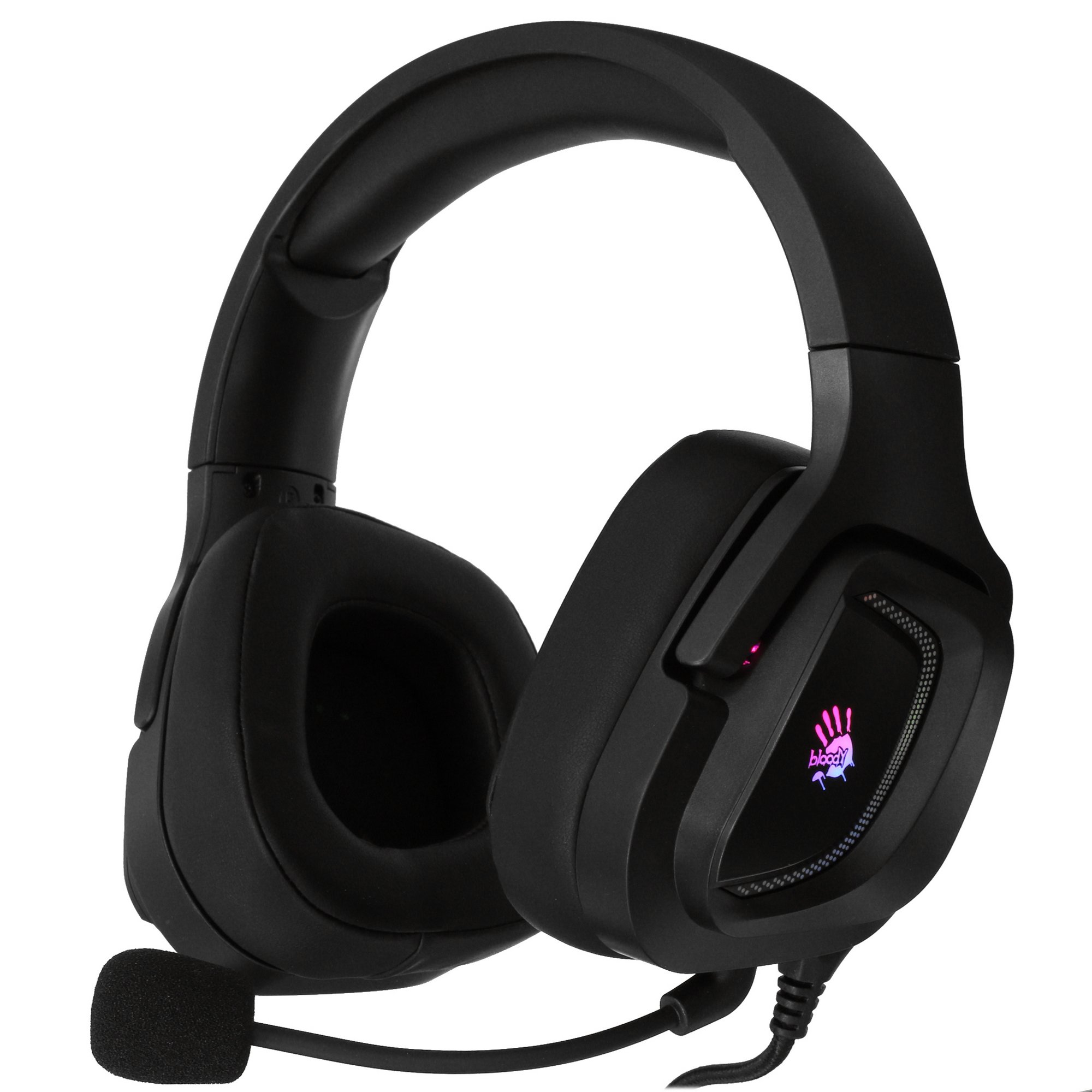 Проводная гарнитура A4Tech Bloody G573P – игровая модель. Устройство оснащено микрофоном с ветрозащитой и шумоподавлением. Наушники имеют охватывающую конструкцию, обеспечивающую качественную шумоизоляцию. Вы сможете полностью сосредоточиться на игровом процессе. Украшение гарнитуры – многоцветная подсветка с питанием от USB. Дизайн модели классический: он выполнен в черном цвете.