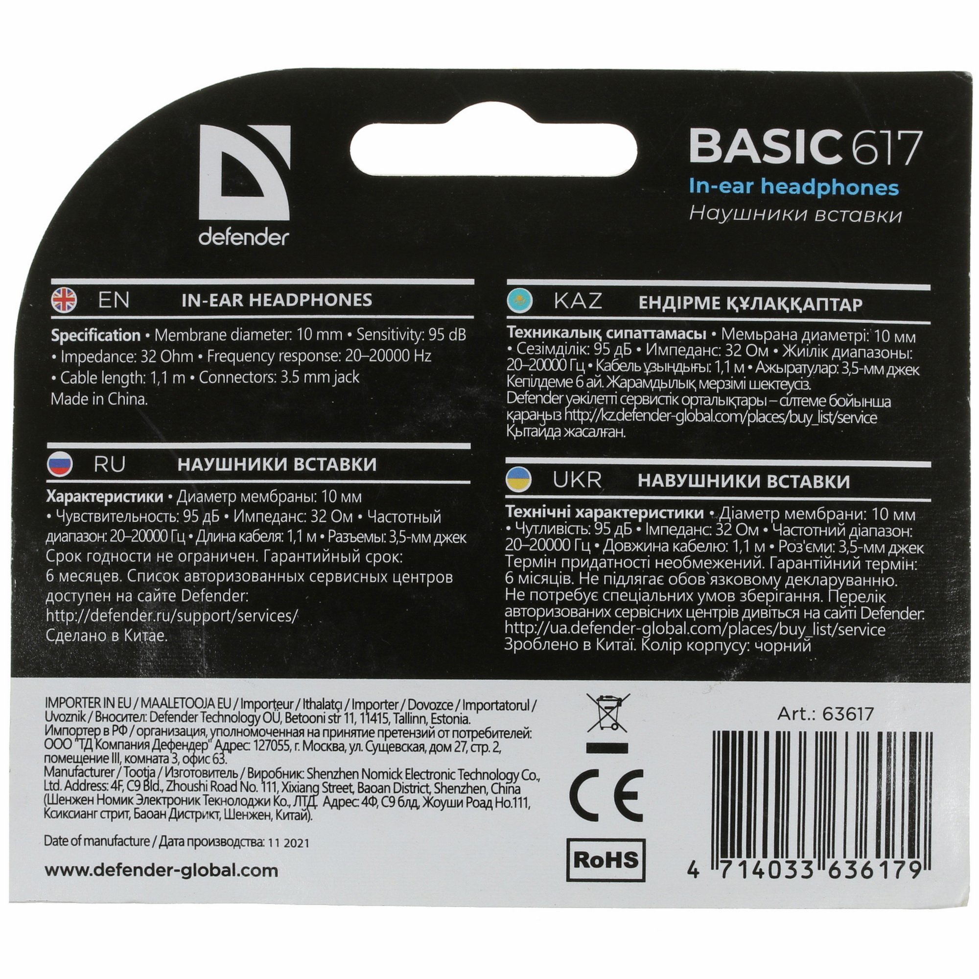Наушники вставки Defender Basic 617 черный