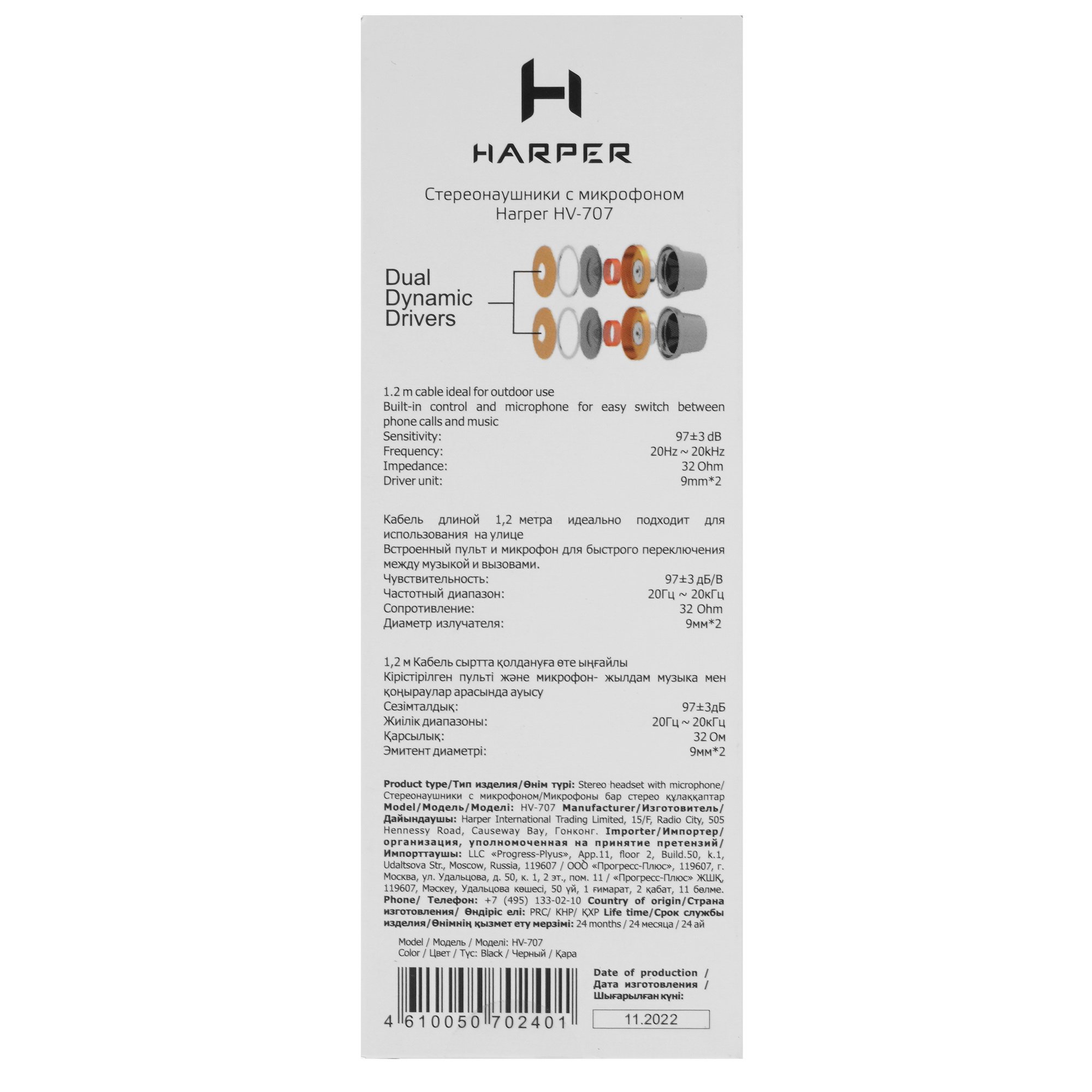 Для удобства использования Harper HV-707 оснащены кабелем длиной 1.2 м с прямым позолоченным штекером. Также у наушников есть встроенный микрофон, кнопки ответа на вызовы и для переключения треков. В комплекте поставки предусмотрено 2 пары сменных амбушюр.