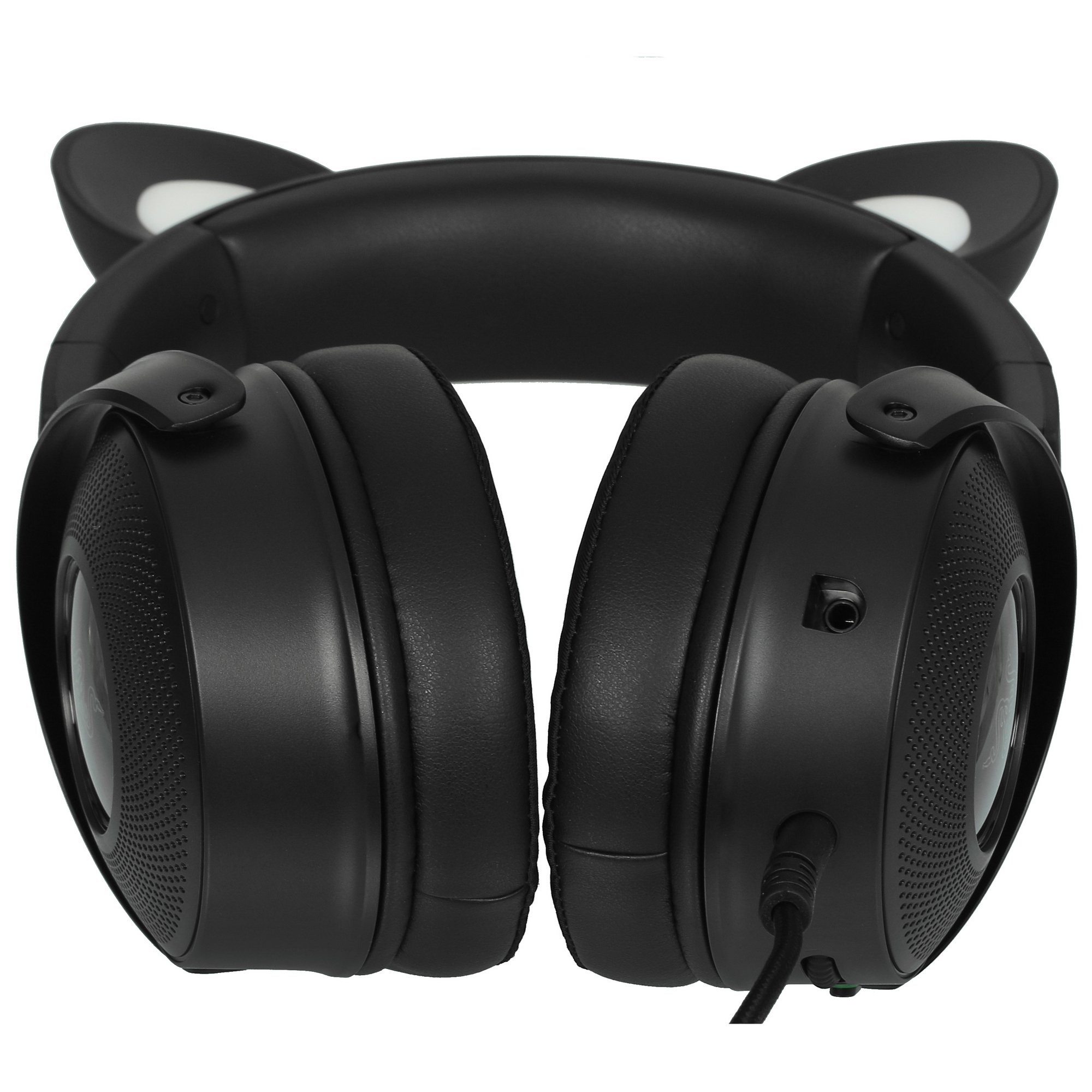 Проводная гарнитура Razer Kraken Kitty V2 Pro черного цвета обладает ярким внешним исполнением, который ей придают ушки на оголовье и настраиваемая RGB-подсветка. Благодаря регулируемому оголовью можно удобно и надежно зафиксировать гарнитуру на голове. 62-мм амбушюры из мягкой пены и окантовкой из экокожи плотно охватывают уши, не позволяя внешним шумам искажать звук. Чувствительные мембраны излучателей точно воспроизводят звуки на низких, средних и высоких частотах в формате 7.1 Virtual.