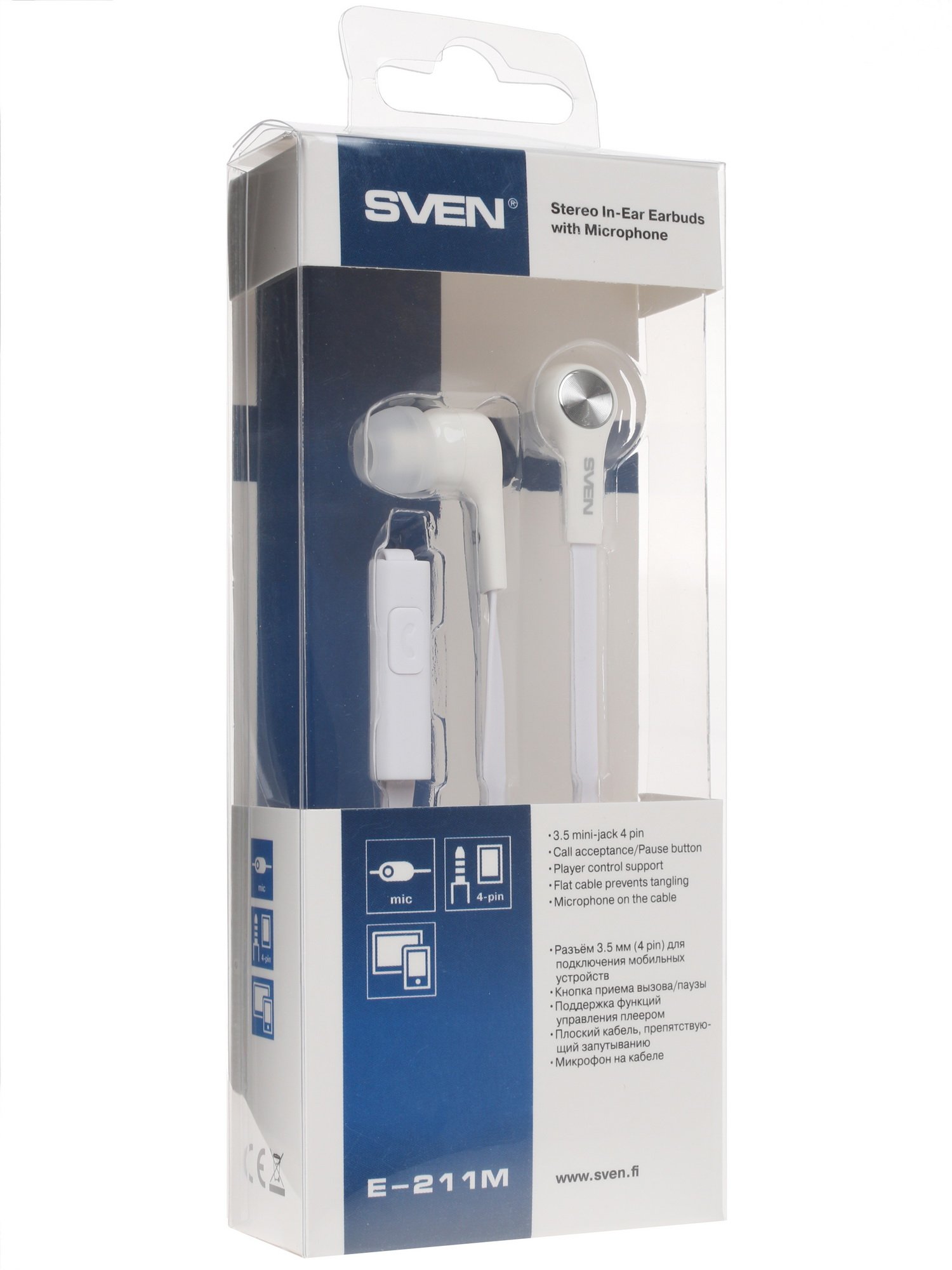 SVEN E-211M может не только передавать поток аудио с хранящего аудиофайлы устройства, но и ставить воспроизводимый звукоряд на паузу, а также отвечать и завершать входящие вызовы. Для этого производитель предусмотрел на проводе пульт дистанционного управления, имеющий в своей конструкции одну универсальную кнопку и микрофон. В зависимости от размеров вашей ушной раковины вы можете подобрать наиболее комфортную для вас пару амбушюр из трех представленных в комплекте (одна уже надета на наушники). Изделие практически не ощущается на голове благодаря минимальному весу - 13 г.