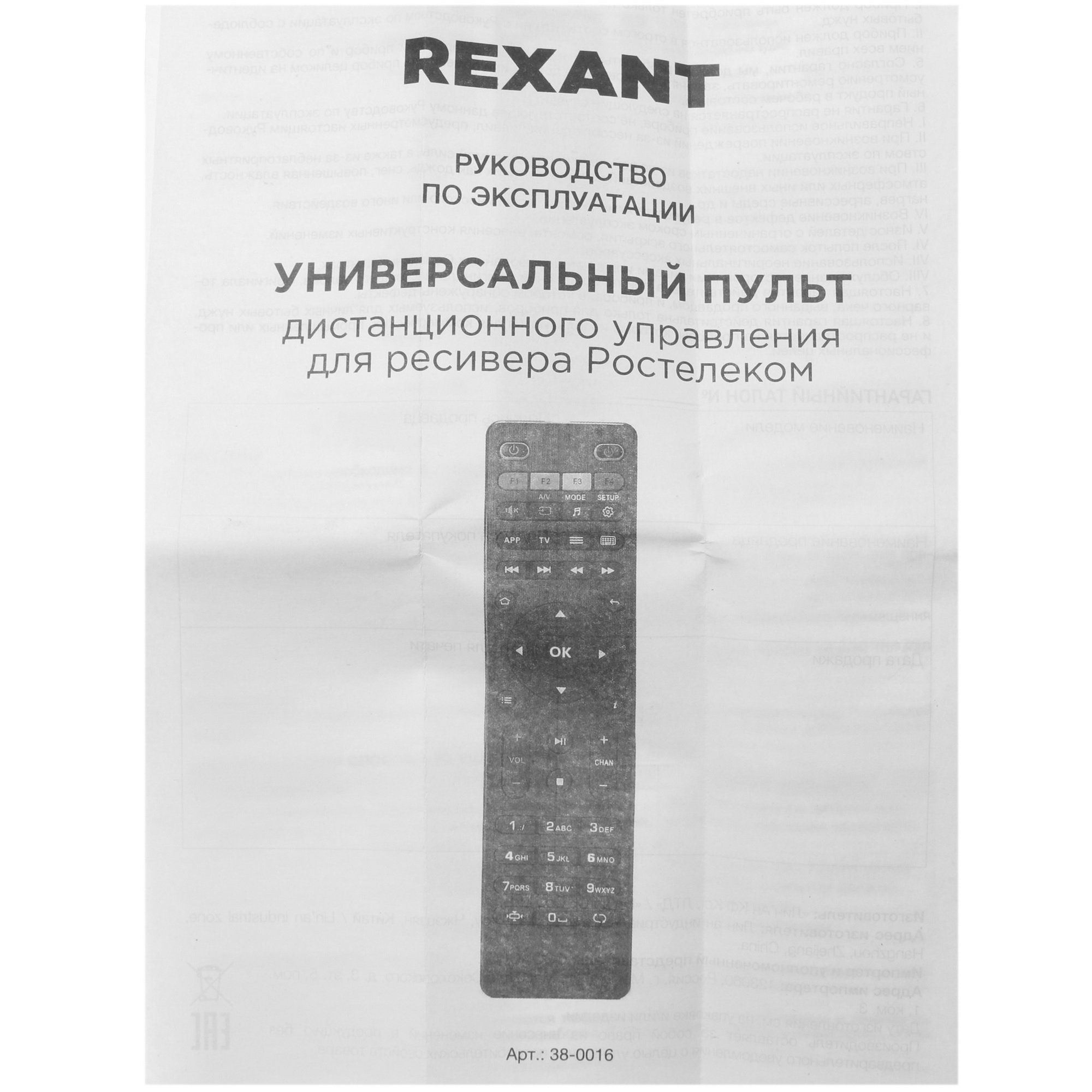 Универсальный пульт дистанционного управления Rexant для ресивера Ростелеком (38-0016)