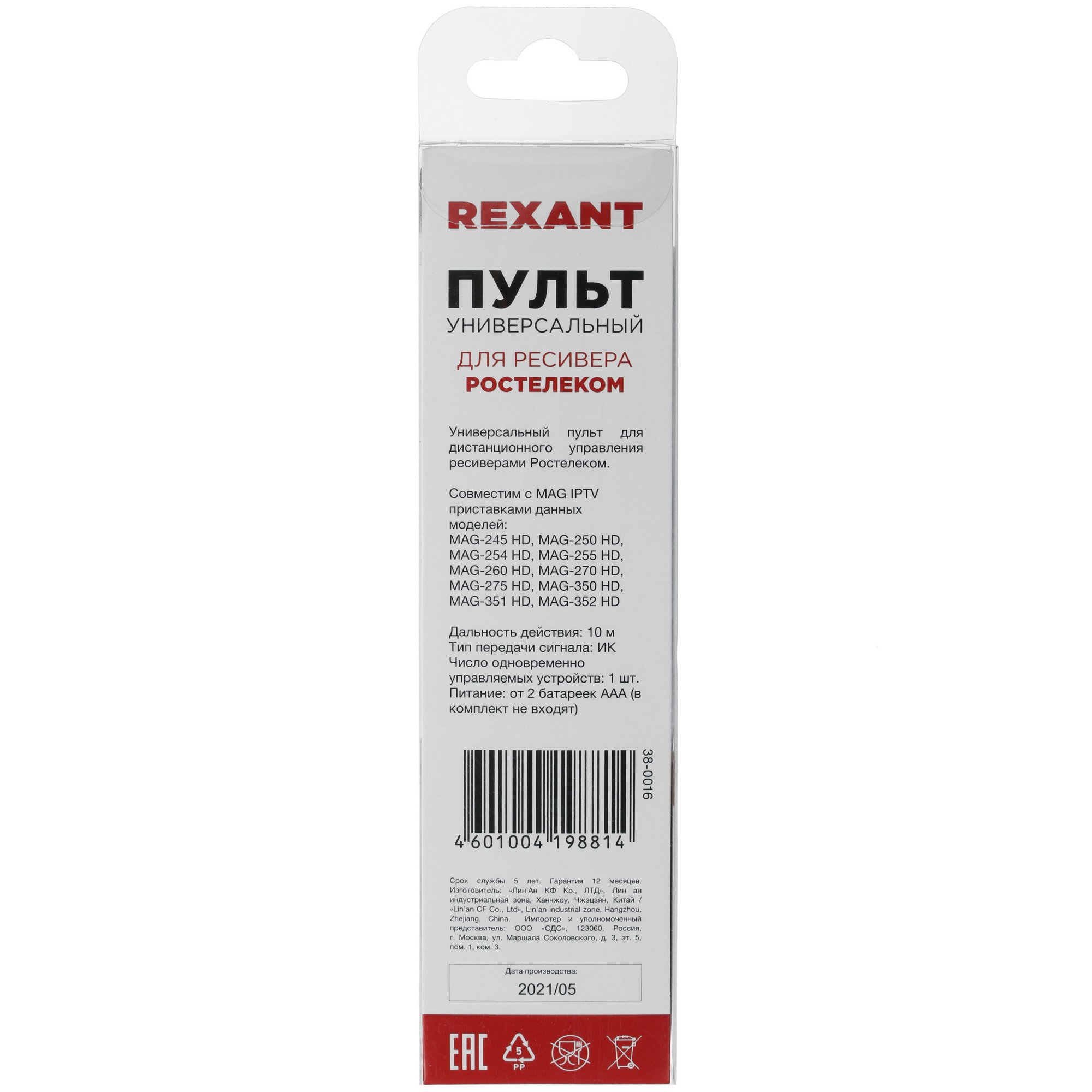 Корпус пульта управления Rexant 38-0016 выполнен из качественного пластика и отличается компактными размерами. В сочетании с эргономичной формой это сделает использование более комфортным. В качестве источника питания пульт использует 2 батарейки типа AAA, которые обеспечат продолжительное время его автономной работы.