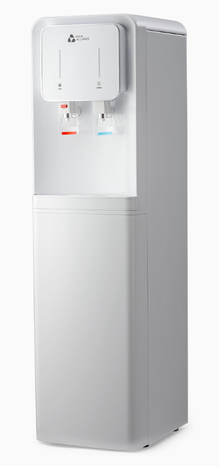 Пурифайер Aquaalliance A65s-LC white выполнен в белом корпусе размерами 32x112x35.7 см. Это кулер с системой фильтрации, который подключается к водопроводу. После очистки вода попадает в бак, а из него в емкости для горячей и холодной воды объемом 5 л и 7 л. Для подачи воды нажимом кружки используются 2 краника. Прибор предусматривает защиту от случайного нажатия.