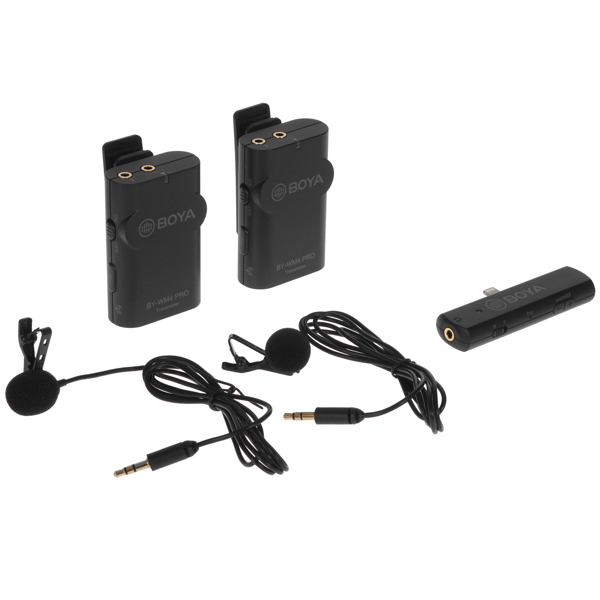 Радиосистема Boya BY-WM4 Pro-K4 отвечает за высокое качество записи звука в ходе интервью, спецрепортажа или создания другого видео. Эта модель оптимизирована под устройства бренда Apple с разъемами Lightning. Дальность приема сигнала для нее составляет до 60 м. Передатчики из комплекта работают от батареек типа ААА.