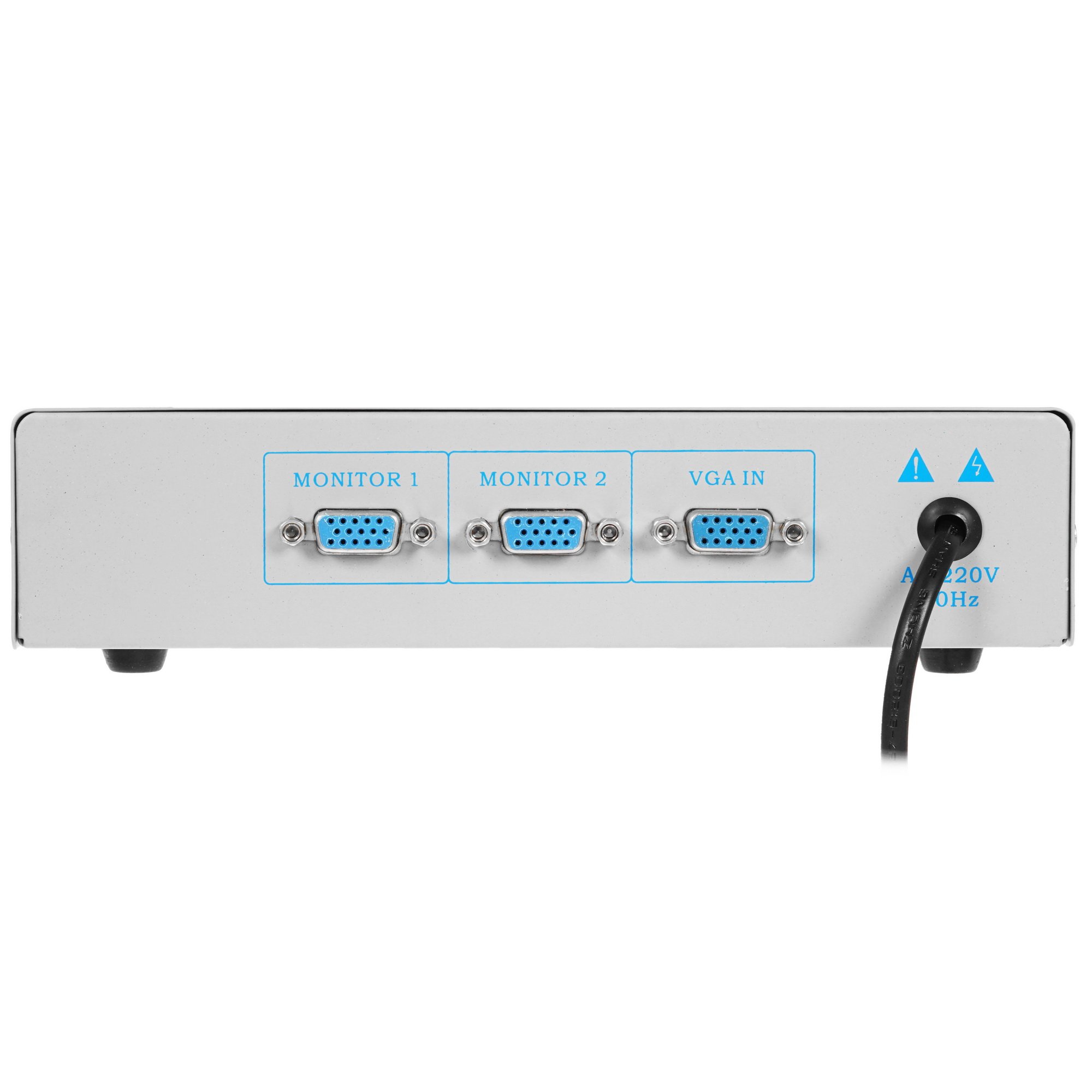 Разветвитель REXANT 17-6922 оснащен кабелем с адаптером для питания от сети 220 В. На корпусе есть 1 вход VGA для подключения к источнику сигнала. 2 выходных разъема VGA обеспечивают стабильную передачу видеоданных на 2 разных экрана. Такой способ подключения сохраняет пропускную способность 150 МГц и высокое качество изображения даже при использовании длинных кабелей.