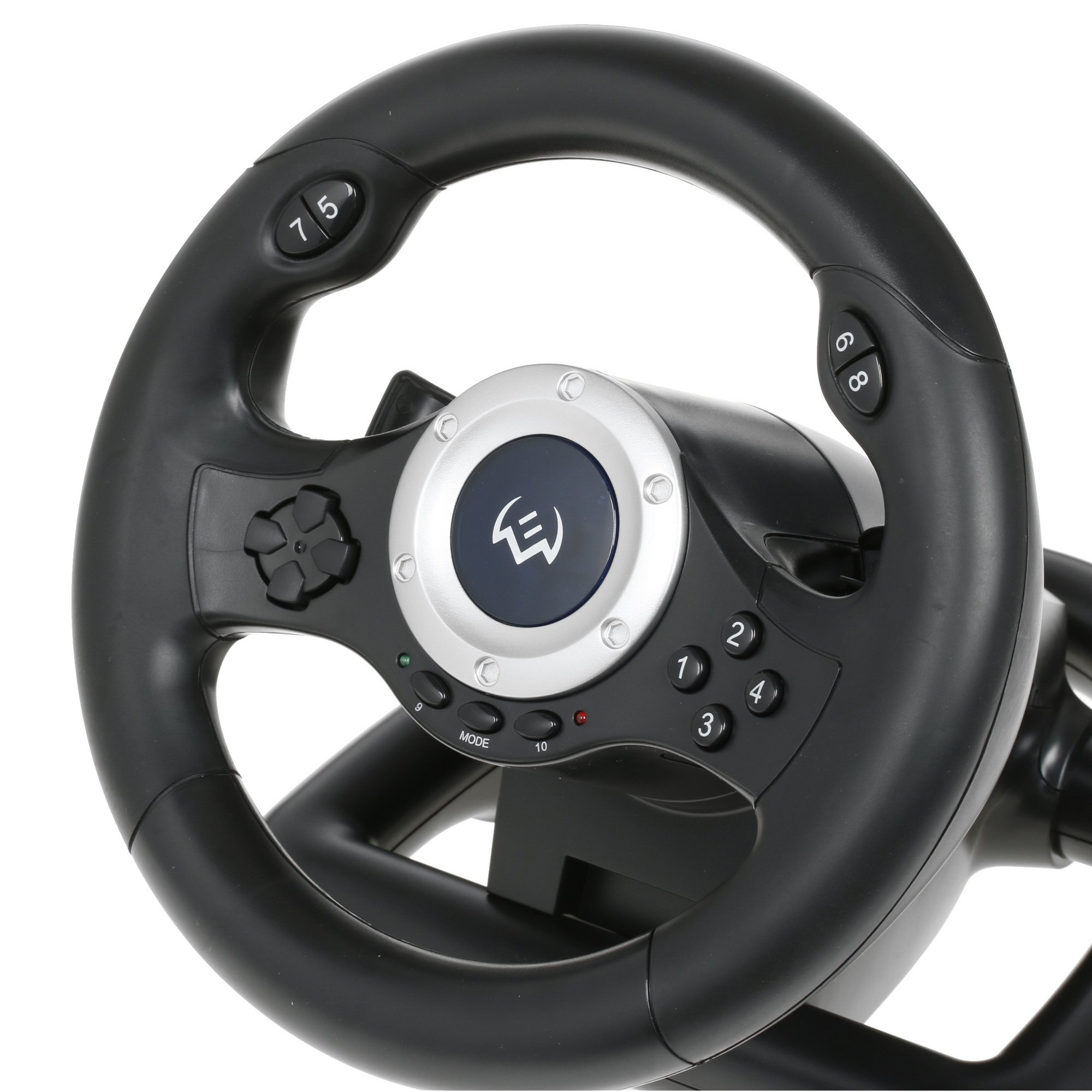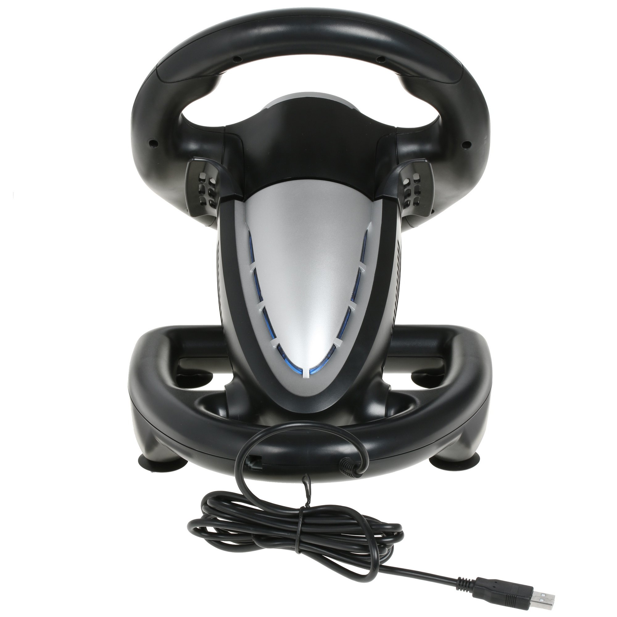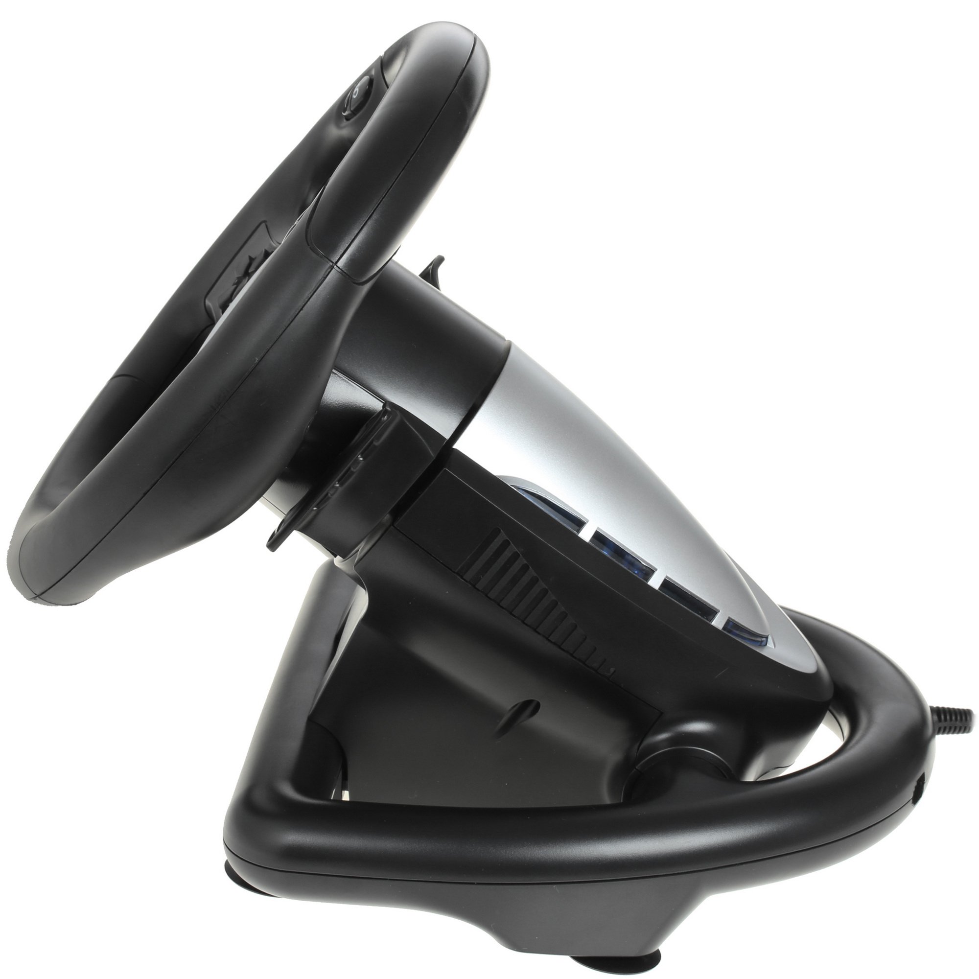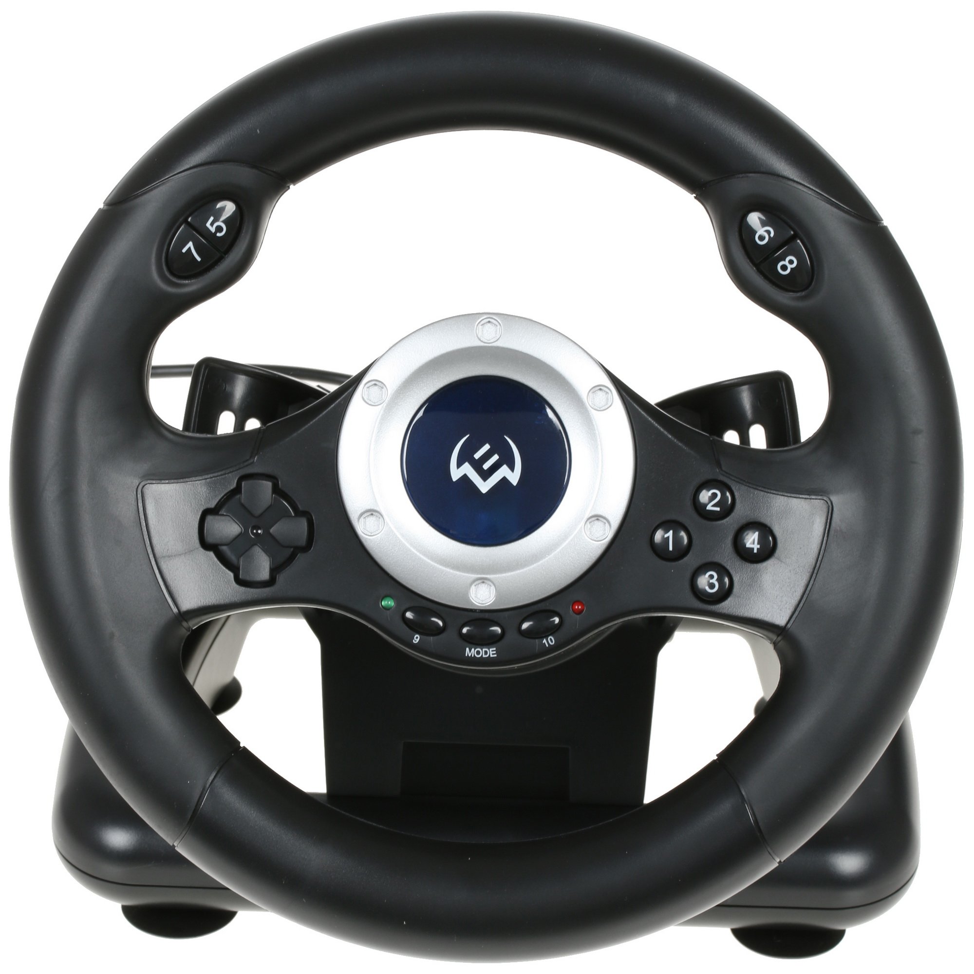 Руль SVEN GC-W500 диаметром 24 см предназначен для прохождения компьютерных гонок. В конструкции модели предусмотрены специальные скобы и присоски для надежной фиксации на горизонтальной поверхности. На руле располагаются 10 кнопок. Модель может поворачиваться на 180°. За счет резиновой оплетки исключена вероятность неточных действий при езде на трассе. В комплекте вместе с рулем SVEN GC-W500 поставляются педали. С их использованием, а также за счет виброотдачи максимальная реалистичность пользователю гарантирована!