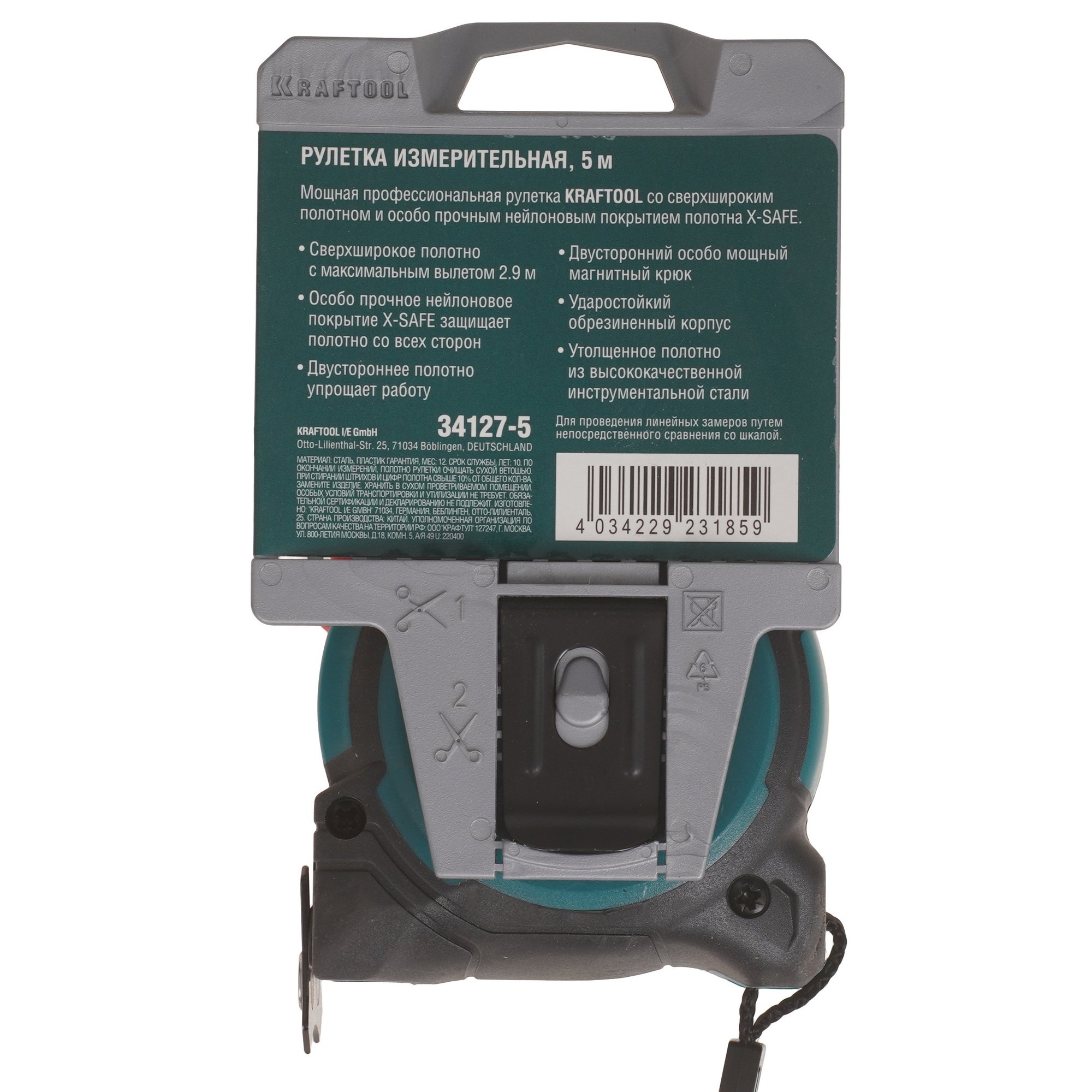 Рулетка измерительная KRAFTOOL 34127-5, предназначена для измерения линейных размеров путем непосредственного сравнения со шкалой. Особопрочное нейлоновое покрытие X-SAFE защищает полотно со всех сторон.