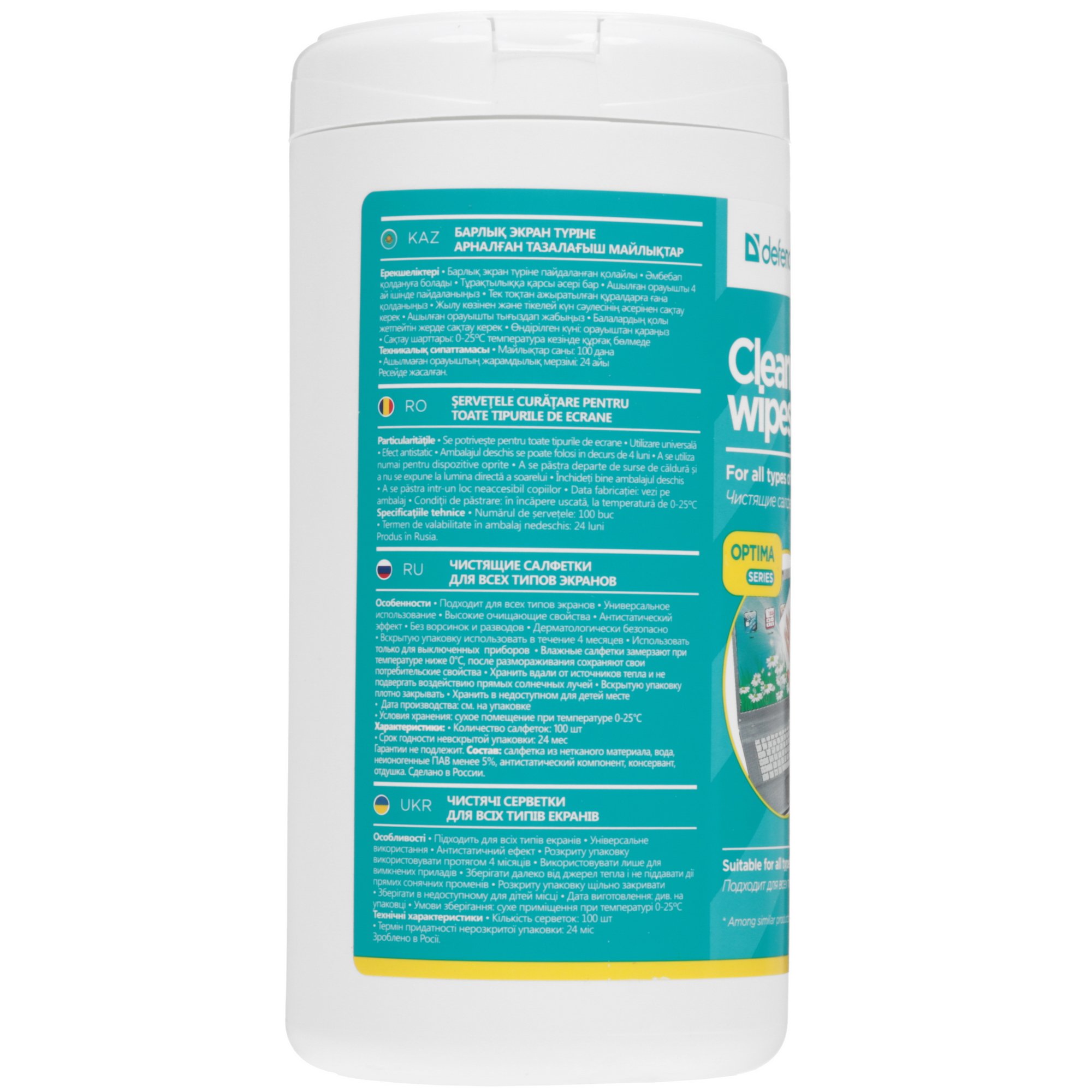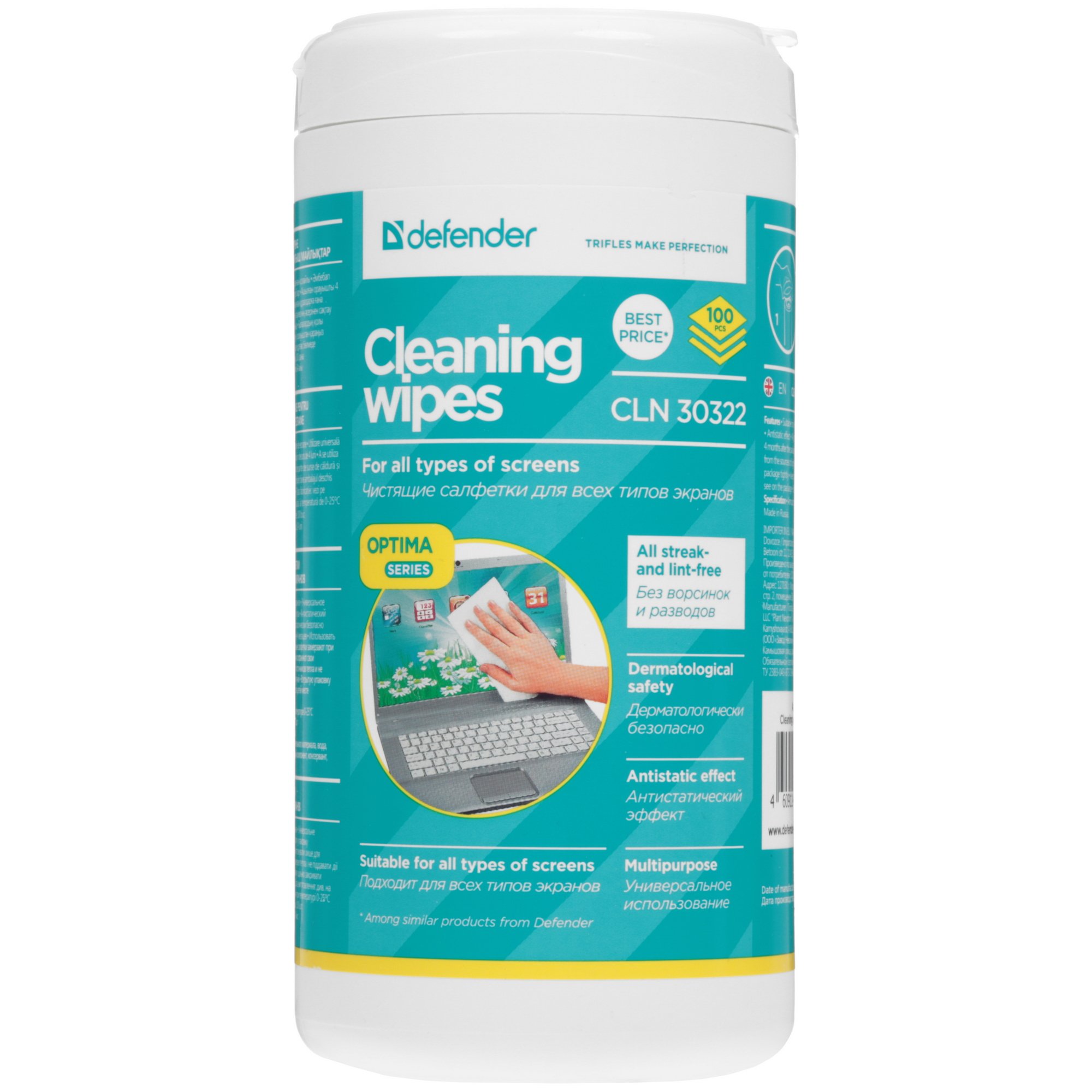 Чистящие салфетки Defender для экранов всех типов / нетканый материал / антистатик / туба /100 шт/ Россия.