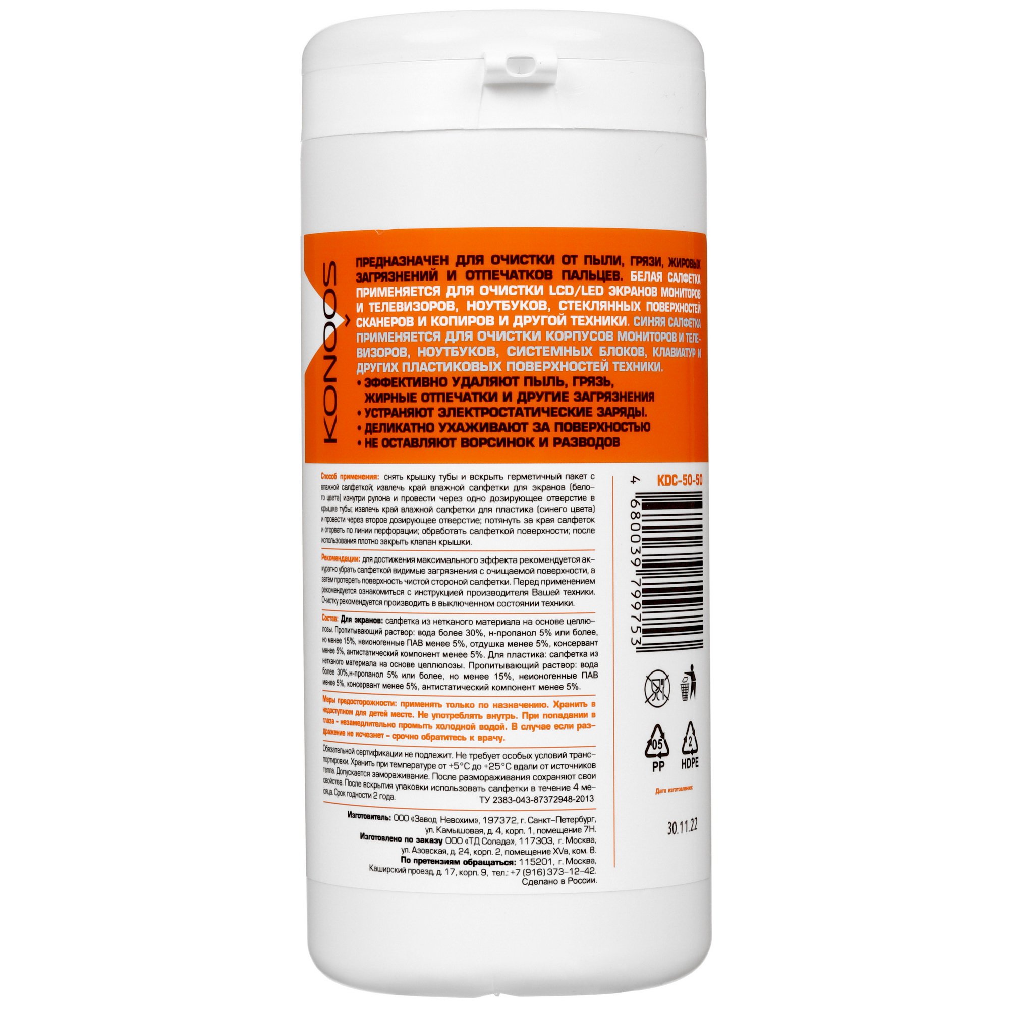 Влажные салфетки Konoos KDC-50-50 предназначены для очистки экранов и пластиковых поверхностей. Тип упаковки – туба. Количество салфеток Konoos KDC-50-50 – 100. Изделия не оставляют разводов и ворсинок.