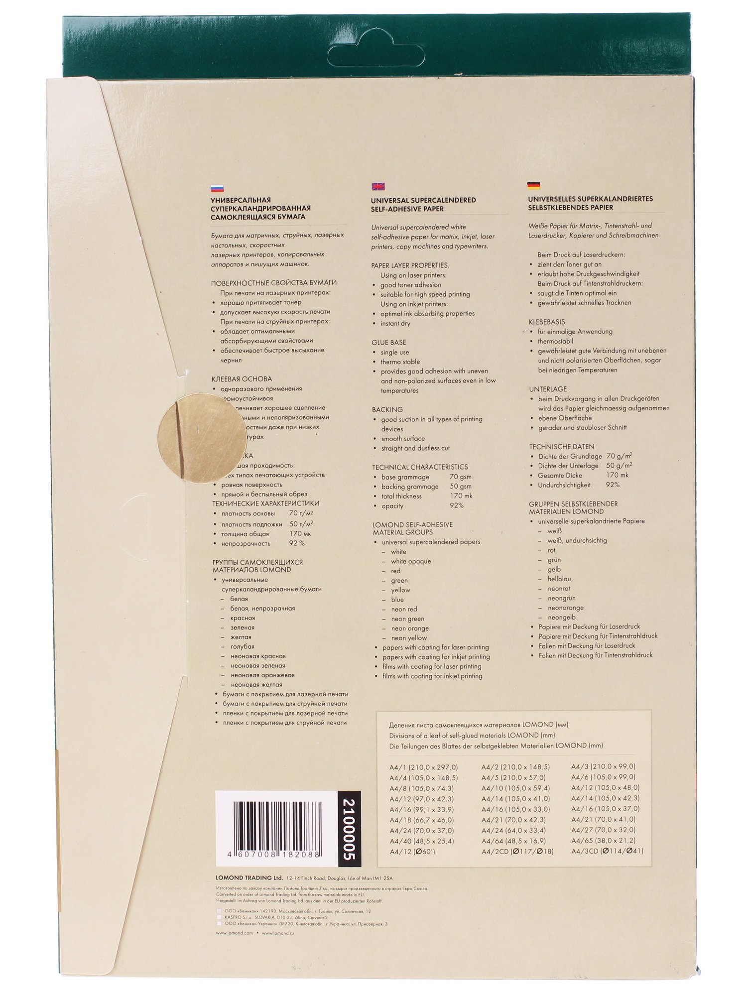 Бумага Lomond 2100005 предназначается для изготовления наклеек и этикеток. Самоклеющееся изделие реалистично передает цвет, четко отображает контуры, не размывает изображение, полностью передает цвета.