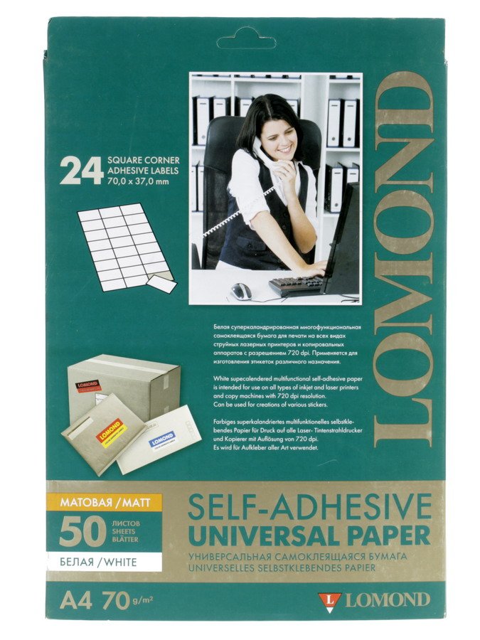 Самоклеящаяся бумага Lomond 2100165 настолько универсальна, что подходит для любых принтеров (лазерных, струйных, матричных) и даже печатных машинок. Также на ней можно писать ручками и маркерами. В пачке 50 листов формата А4, разделенных на 24 фрагмента размером 70x37 мм. На них отлично помещаются адресные блоки для крупных конвертов или небольших посылок.