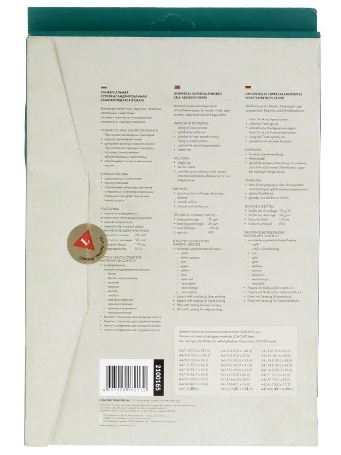 Адгезивный (клеевой) слой Lomond 2100165 устойчив к воздействию высоких и низких температур и обеспечивает надежную фиксацию бумаги на любой поверхности. Это значит, что этикетка останется на месте в любую погоду.