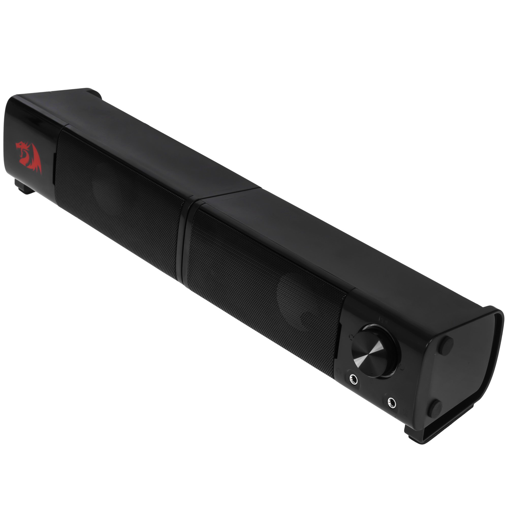 Саундбар Redragon Orpheus в корпусе черного цвета имеет выход 3.5 Jack для сопряжения с внешними устройствами, а также разъемы для подключения гарнитуры и микрофона. Конструкцией предусмотрено 2 стереодинамика общей мощностью 6 Вт для воспроизведения чистого звука без эха или помех.
