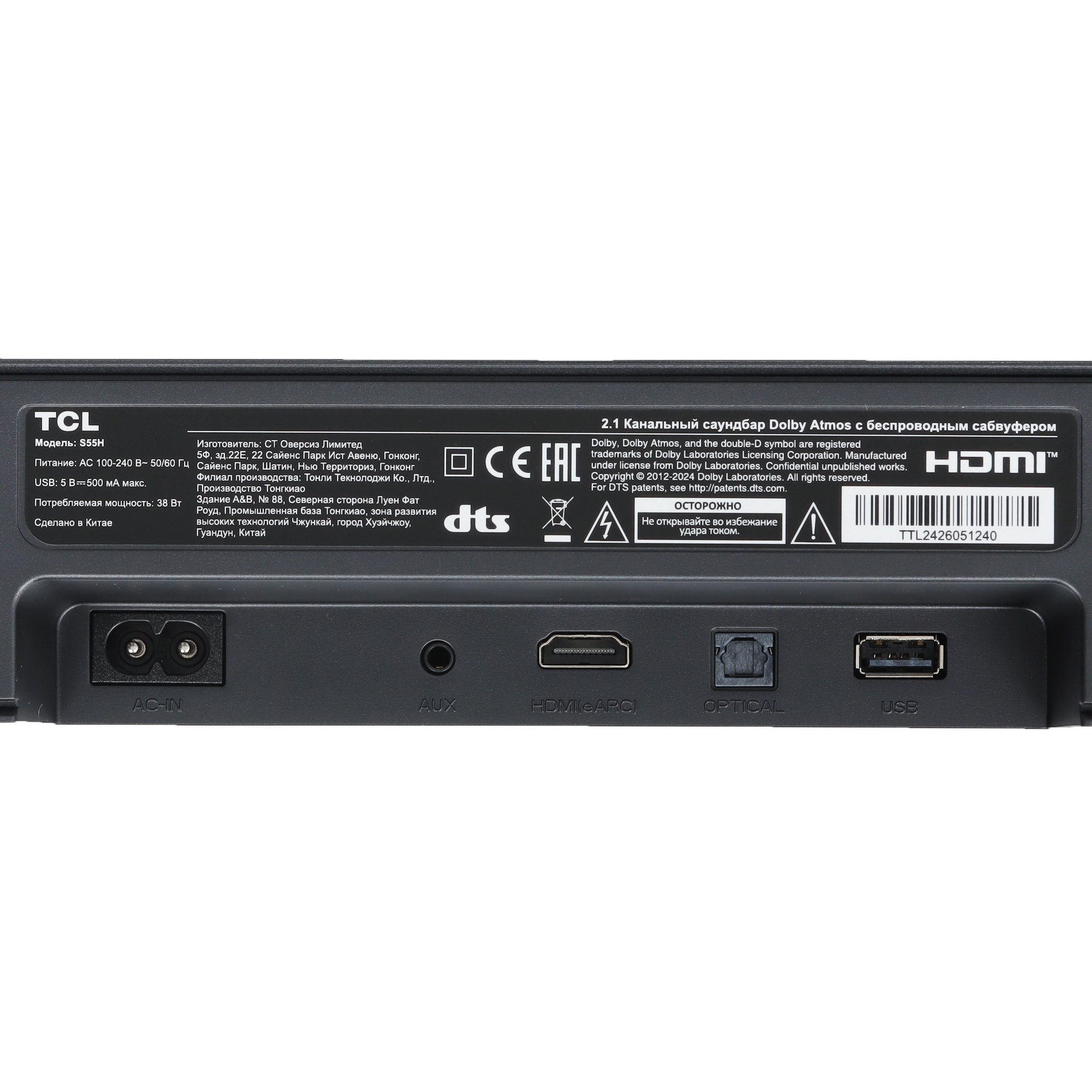 Саундбар TCL S55H оснащен подсветкой Skyline, которая создает вовлекающую атмосферу и помогает получить больше удовольствия. Благодаря поддержке технологий Dolby Atmos и DTS Virtual:X устройство обеспечивает эффект трехмерного звучания и окружает зрителя реалистичными эффектами. Особенностью модели является сенсорное управление на корпусе.