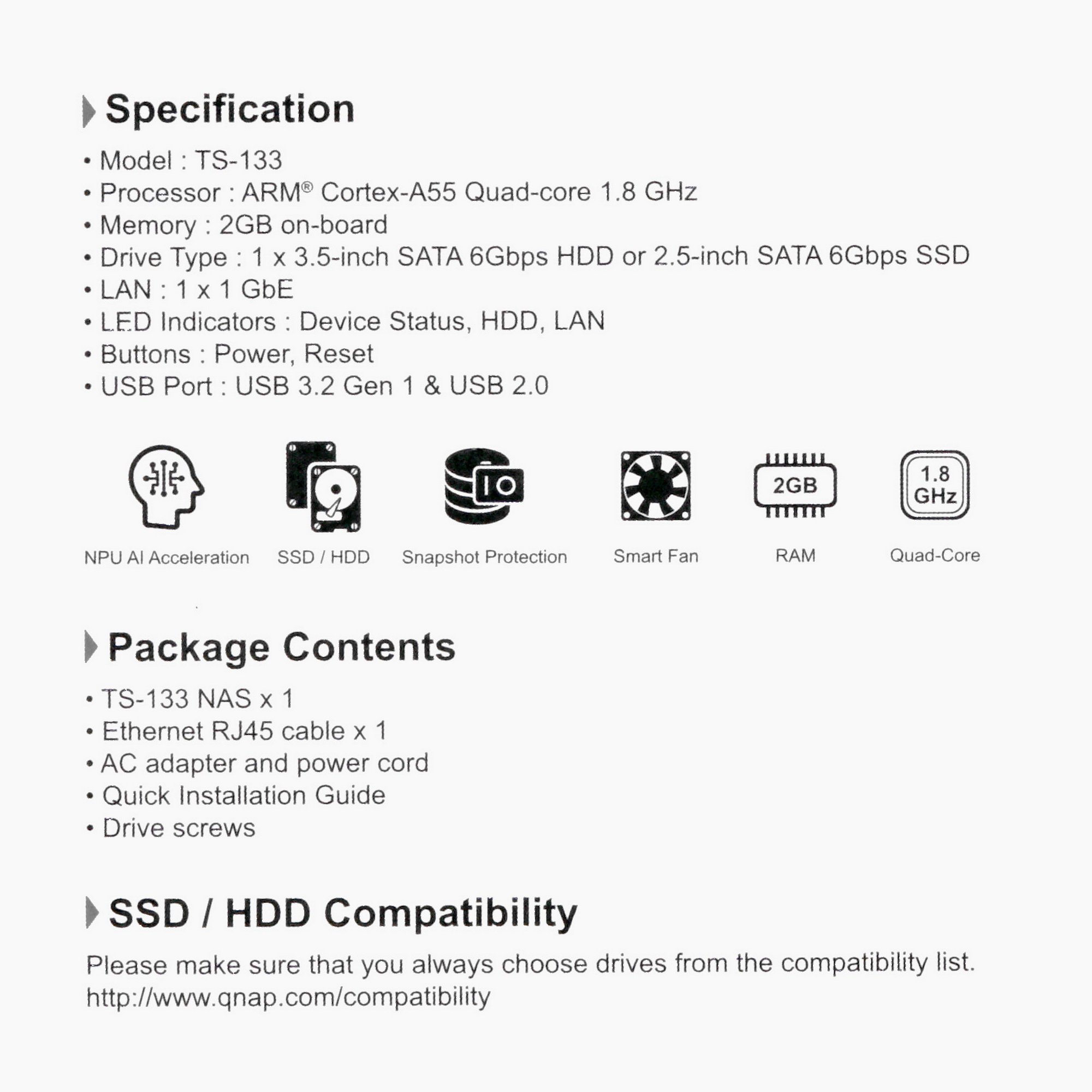 Сетевое хранилище SMB QNAP TS-133 NAS 1 HDD tray. ARM 4-core Cortex-A55 1.8GHz, ram 2 Gb (max), 1x1GbE, 1xUSB 2.0 port,1xUSB 3.2 Gen 1