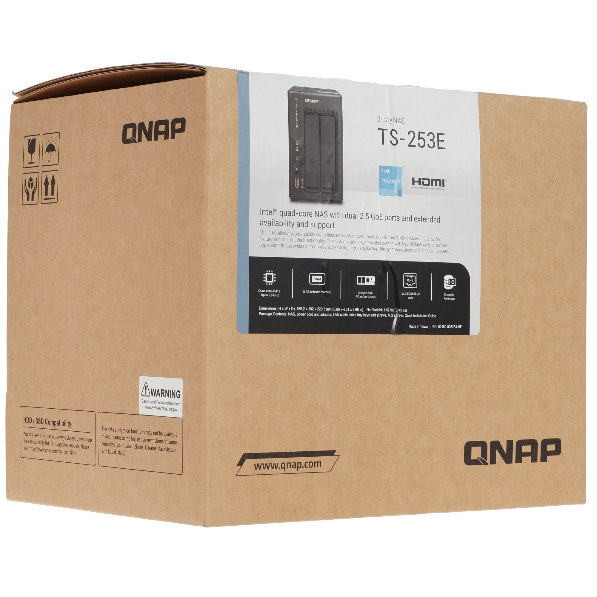 SMB QNAP TS-253E-8G NAS, 2-tray w/o HDD. 2xHDMI-port. 4-core Celeron J6412 2-2.6 GHz, 8Gb DDR, 2x2.5Gb LAN, 2 x M.2 2280 PCIe Gen 3 x2, 2x USB 3.2 Gen 2 (10Gbps) Port, 2x USB 2.0 port