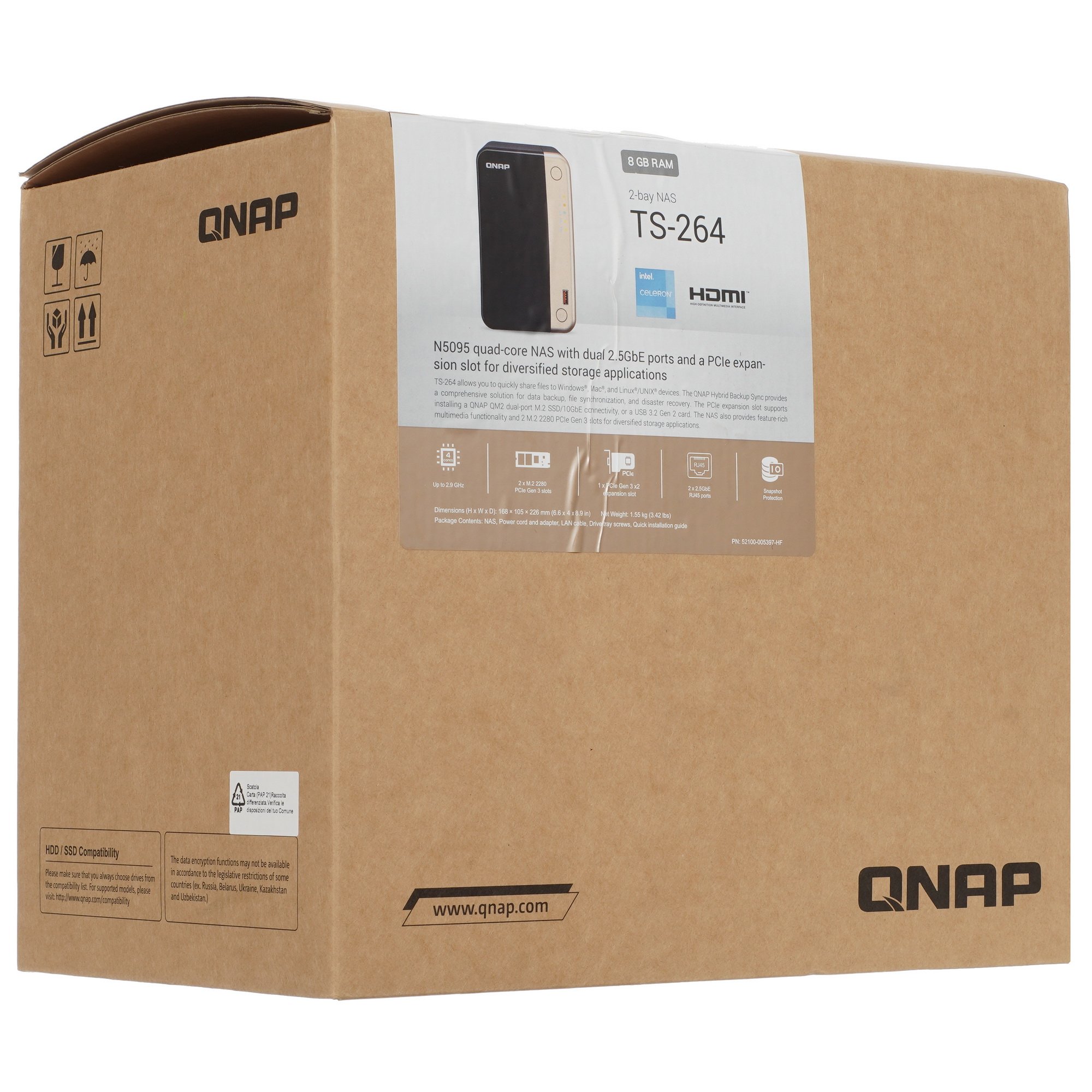 Сетевое хранилище QNAP TS-264-8G – универсальное решение для размещения и управления данными в среднем и крупном бизнесе. Оно поддерживает функционирование с 2 жесткими дисками и позволяет управлять ими с помощью RAID-массивов. Устройство оснащено процессором с тактовой частотой 2.9 ГГц и 8 ГБ оперативной памяти. Это сочетание обеспечивает стабильную и продуктивную работу системы даже при больших объемах данных.