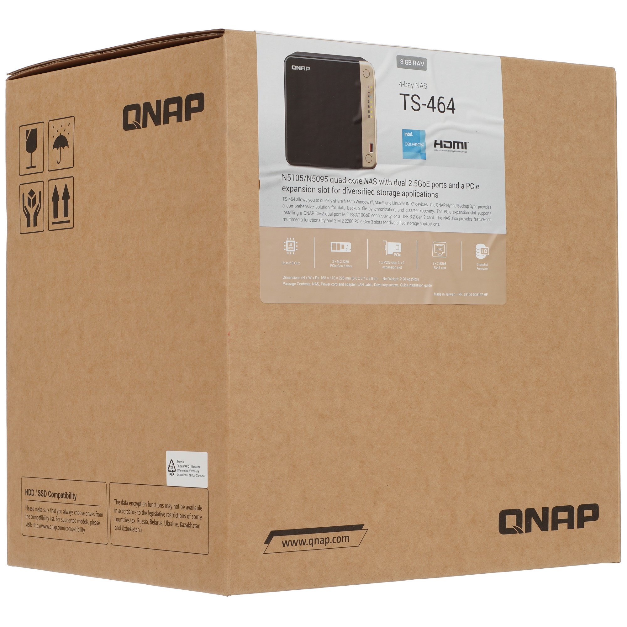 Сетевое хранилище (NAS) QNAP TS-464-8G предлагает достойную производительность и надежность для размещения и обмена данными в домашних или офисных сетях. Устройство оснащено процессором Intel Celeron N5095/5105 с тактовой частотой 2.9 ГГц и 8 ГБ оперативной памяти. Оно поддерживает 4 отсека для жестких дисков, что позволяет создавать массивы RAID для защиты данных и увеличения доступного пространства для хранения.