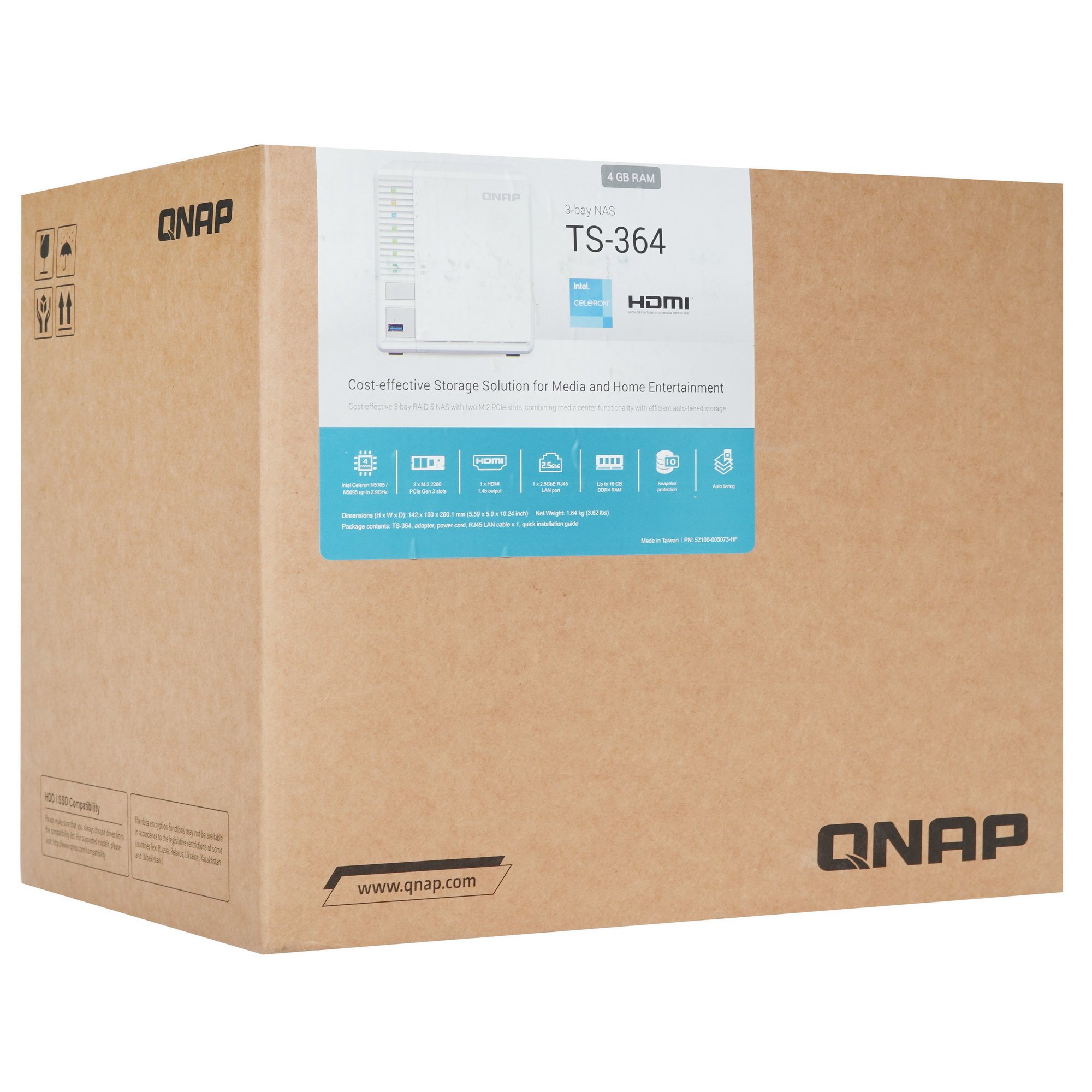 Сетевое хранилище (NAS) QNAP TS-364-4G обладает высоким уровнем производительности. Быстрое обращение с файлами при записи и чтении гарантируют 4-ядерный процессор Intel Celeron N5105 и 4 ГБ оперативной памяти. Сетевое подключение хранилища осуществляется посредством 2.5-гигабитного порта Ethernet. Активная система охлаждения, представленная единственным вентилятором, исключает перегрев устройства и смонтированных накопителей. Наличие USB-портов позволяет выполнять подключение внешних дисков и флеш-накопителей. Хранилище рассчитано на настольное размещение.