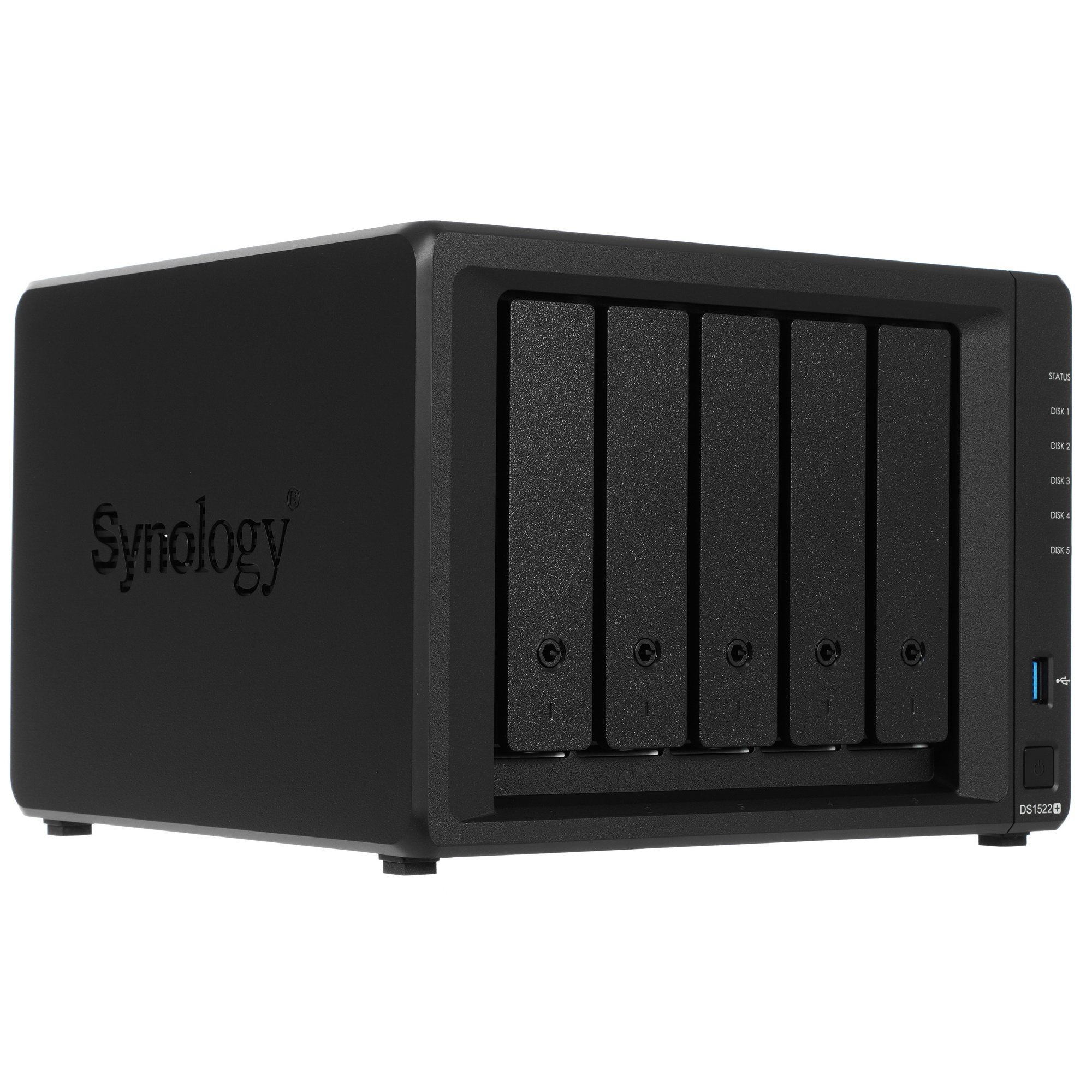 Сетевое хранилище (NAS) Synology Disk Station DS1522+ имеет 5 отсеков для SATA накопителей, объем каждого из которых может достигать 18 ТБ. Возможно использование не только жестких дисков, но и SSD. Поддерживается функция горячей замены. Хранилище рассчитано на организацию массивов RAID 0, JBOD, RAID 5, RAID 6, Synology Hybrid RAID, RAID 10 и RAID 1. Также возможно использование режима Basic, в котором устанавливается единственный HDD или твердотельный накопитель.