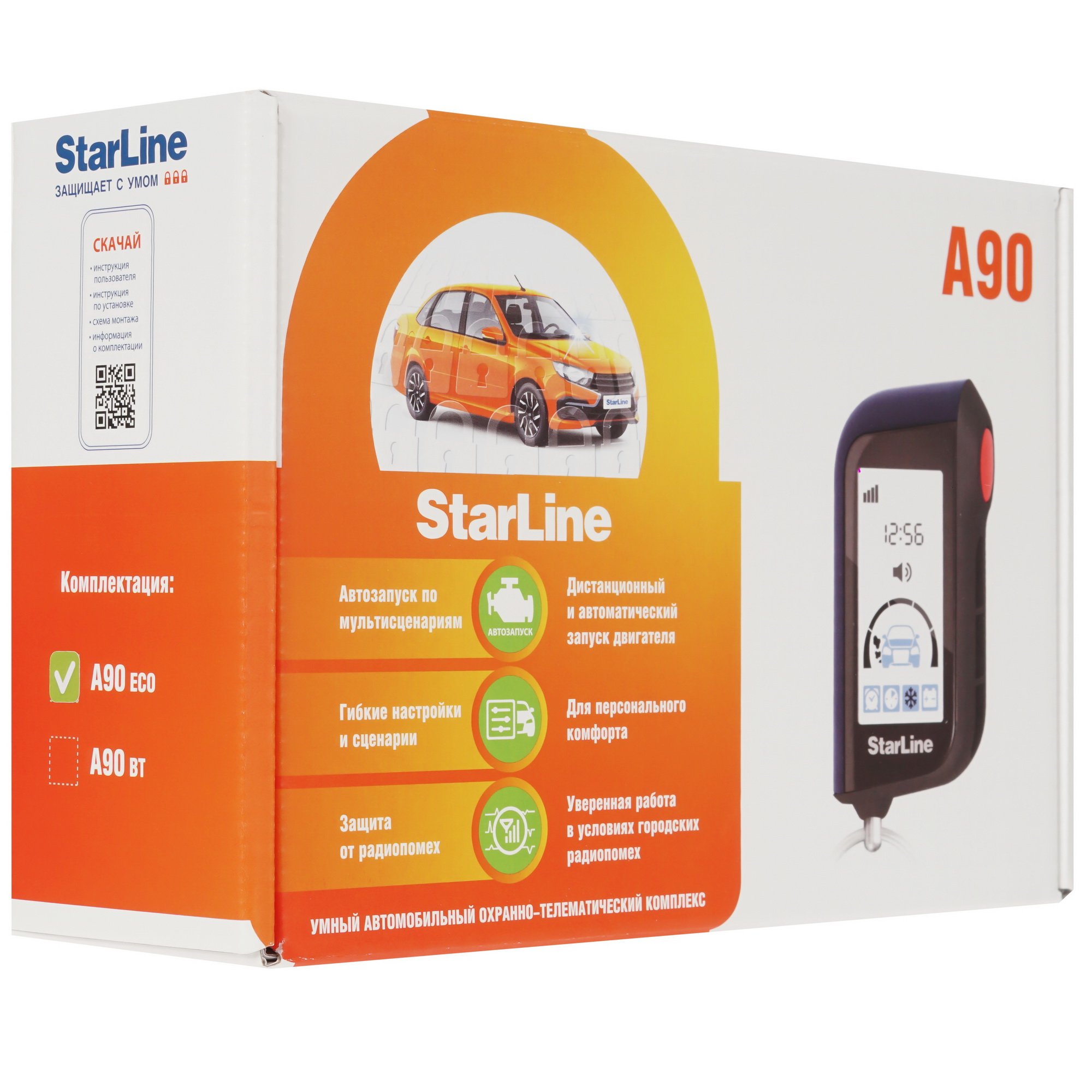 Автосигнализация StarLine A90 ECO стабильно работает в условиях городских радиопомех благодаря узкополосному трансиверу. Диалоговый код управления устойчив к электронному взлому. Система интеллектуального автозапуска предоставляет возможность дистанционного и автоматического запуска двигателя по температуре, в определенное время, при низком заряде аккумулятора и дням недели. На выбор предлагается 60 настроек и сценариев работы автосигнализации StarLine A90 ECO. В комплекте поставляются брелок с дисплеем, блок с 3D датчиком удара/наклона/движения, модуль запуска двигателя, реле, сирена и провода.