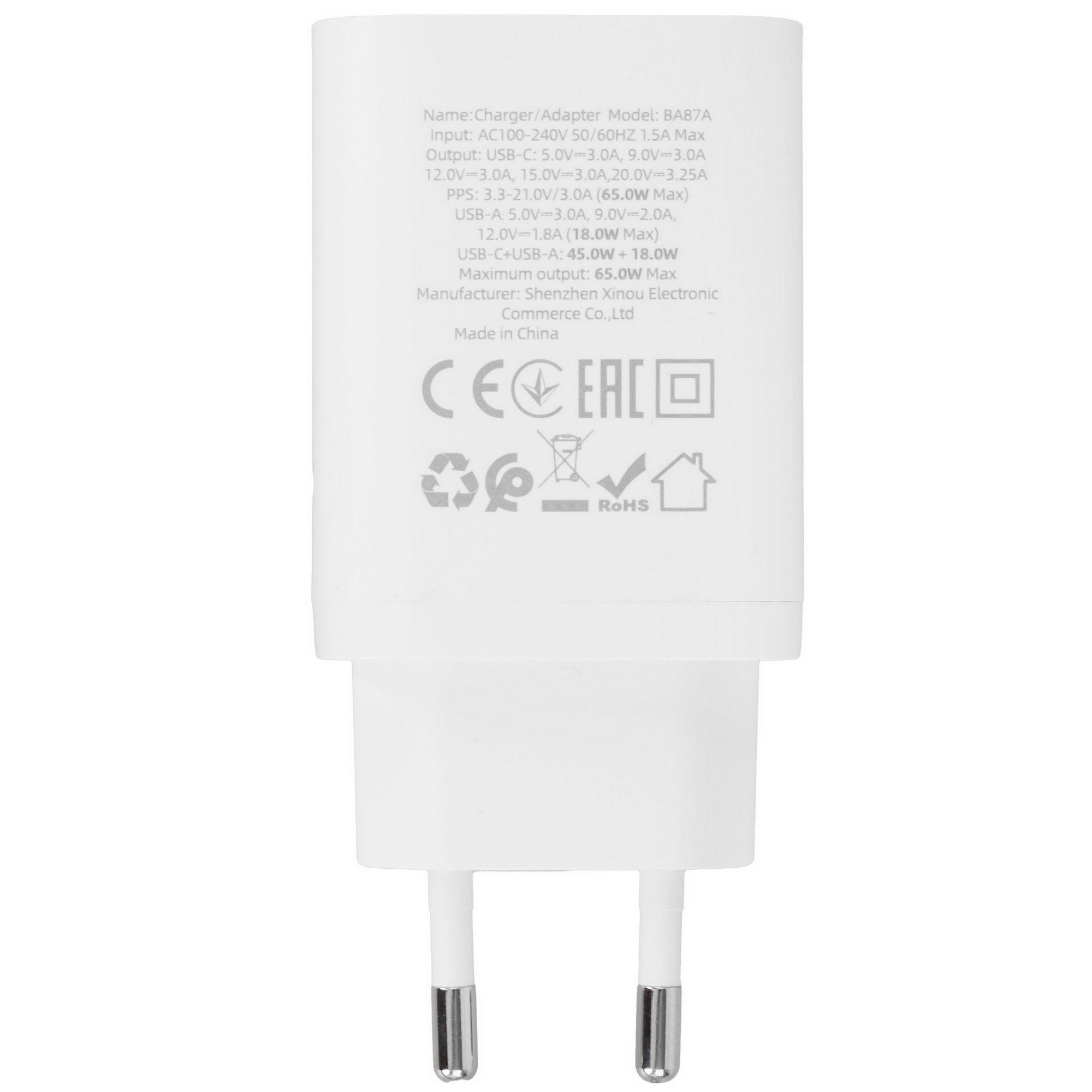 Сетевое зарядное устройство Borofone BA87A в белом корпусе обеспечивает выходную мощность до 65 Вт. Ток на выходе ограничен 3.25 А. Для зарядки используются разъемы USB-C и USB-A.
