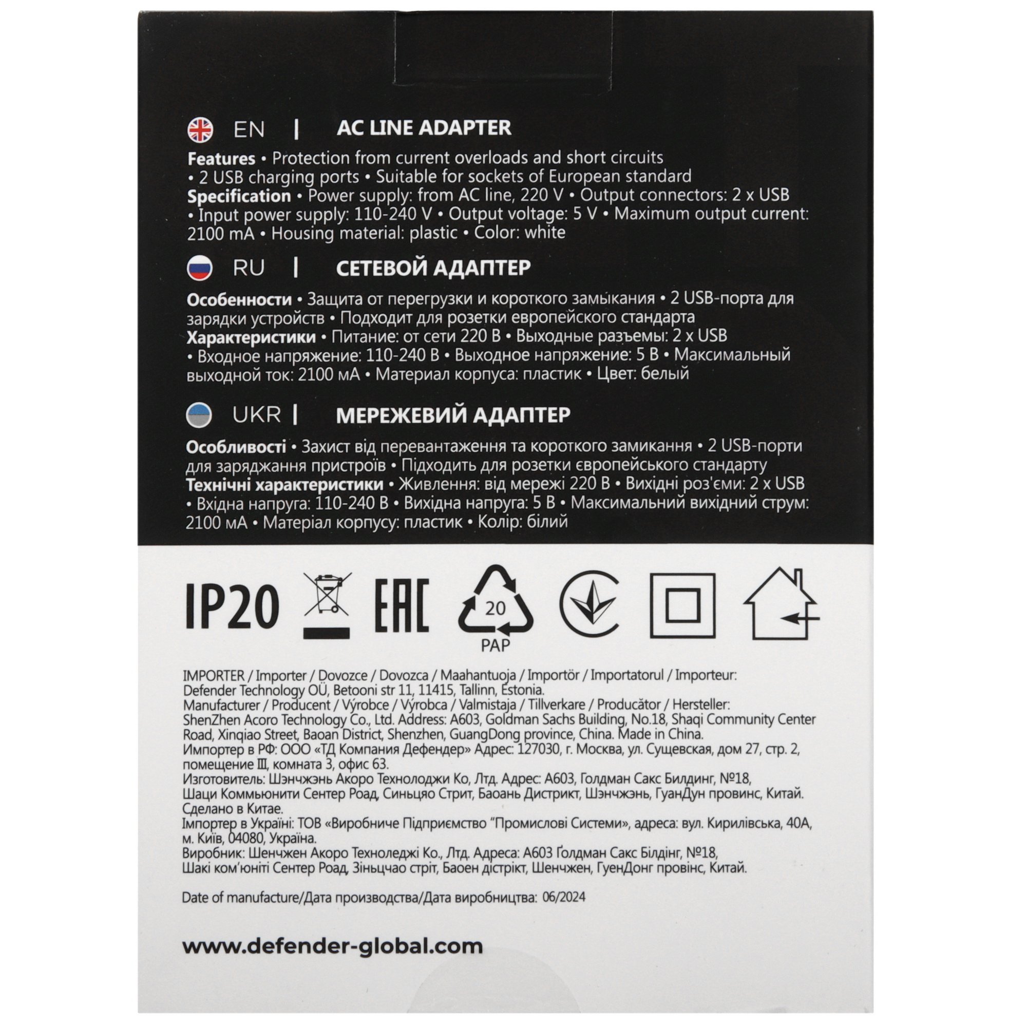 Сетевое ЗУ Defender UPA-22 оснащено двухштырьковой вилкой и подключается к розетке без кабеля. Допустимый диапазон входного напряжения – от 110 до 240 В. Поддерживаются 2 вида защиты – от короткого замыкания и перегрузки.
