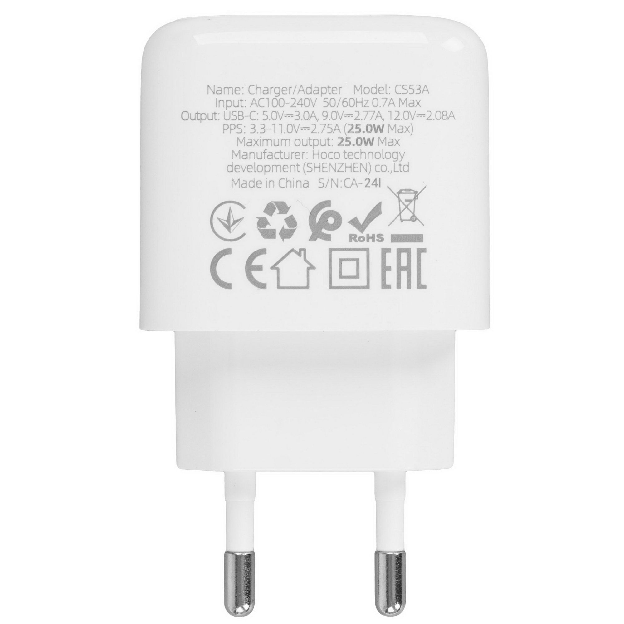 Сетевое зарядное устройство Hoco CS53A выполнено в белом корпусе из огнеупорного пластика. Изделие поставляется с кабелем USB Type-C длиной 1 м. Вилка европейского стандарта. LED индикатор отображает сведения о процессе зарядки.