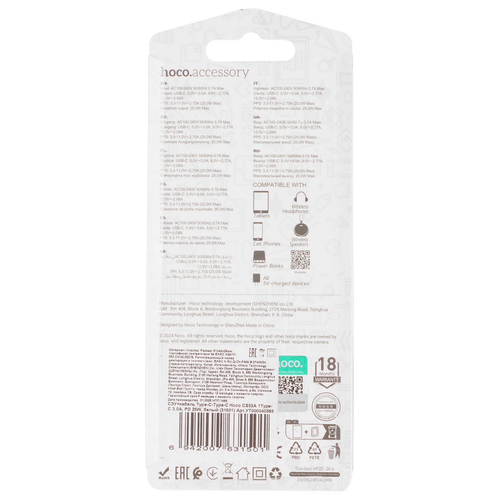 В Hoco CS53A предусмотрена защита от короткого замыкания, перегрева, перегрузки, перезаряда батареи и перенапряжения. Адаптер поддерживает стандарт PPS, благодаря которому обменивается данными с заряжаемым устройством, динамически регулирует ток и напряжение.