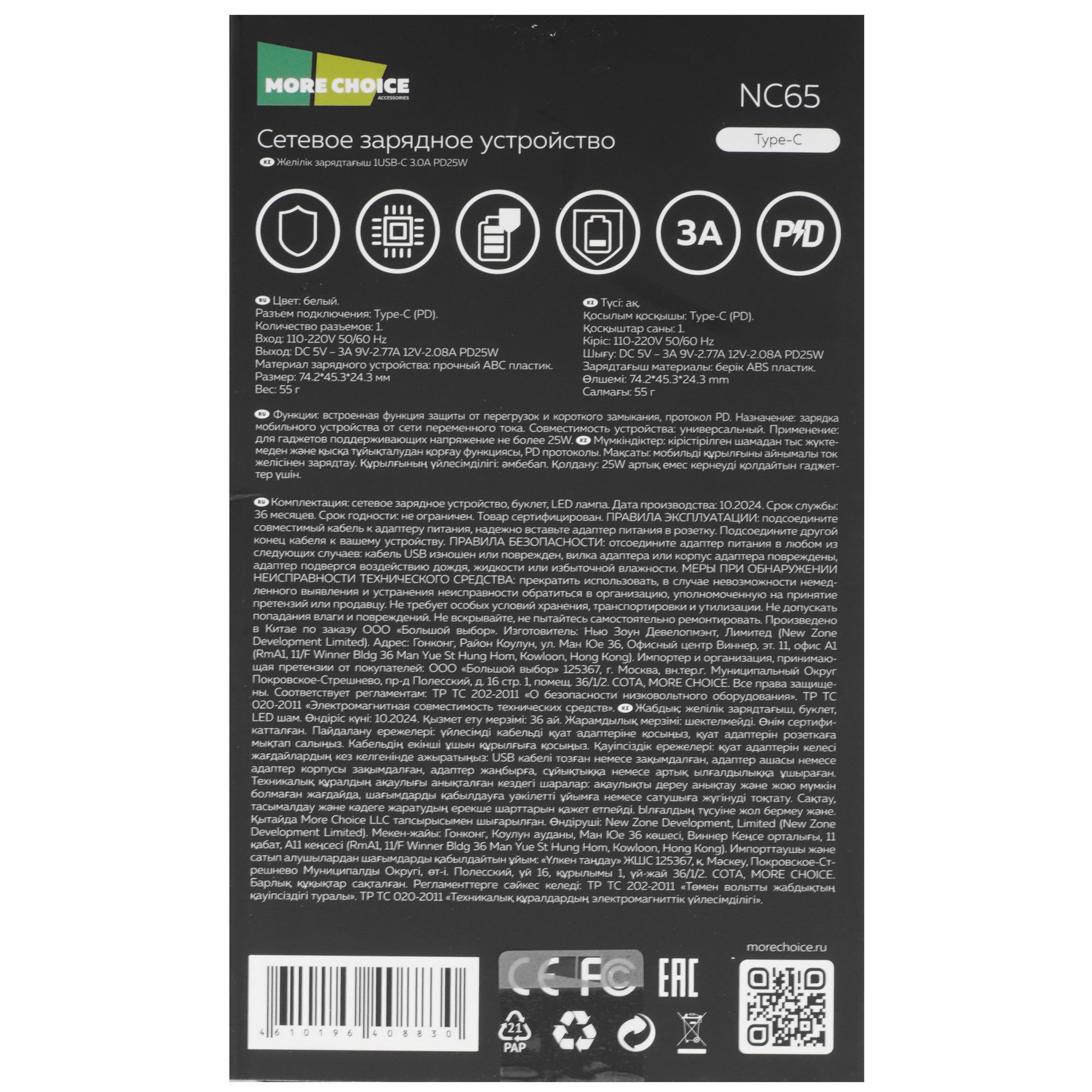 Сетевое зарядное устройство More Choice NC65 — это идеальный выбор для тех, кто ценит скорость и эффективность в зарядке своих устройств. Зарядное устройство для телефона с мощностью 25W и током до 3А обеспечивает быструю зарядку, позволяя быстро восстановить заряд. Поддержка протокола быстрой зарядки PD гарантирует, что устройство будет заряжаться максимально быстро и безопасно.