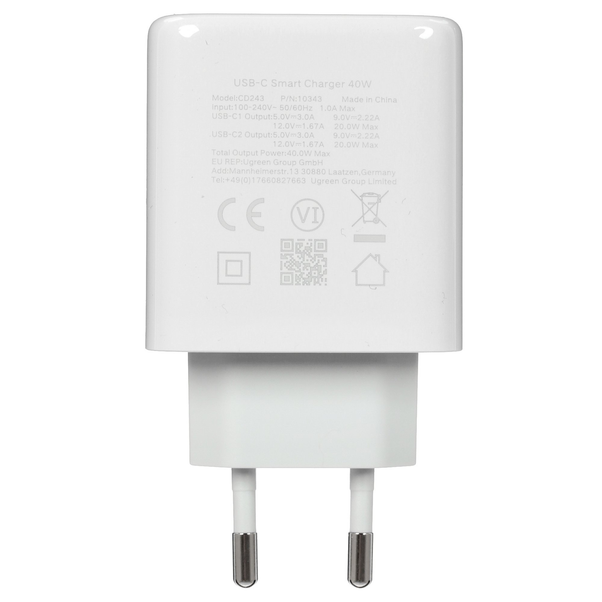 Сетевое зарядное устройство Ugreen CD243 станет надежным решением для подзарядки смартфона, планшетного компьютера и прочих устройств. В его оснащение входят два разъема USB Type-C. Данная модель отличается показателем выходной мощности 40 Вт и поддержкой протоколов ускоренного восстановления энергоресурса. Интеллектуальный чип обеспечивает сбалансированное распределение тока. В свою очередь, комплексная система с рядом технологий защиты гарантирует повышенную безопасность в использовании Ugreen CD243.