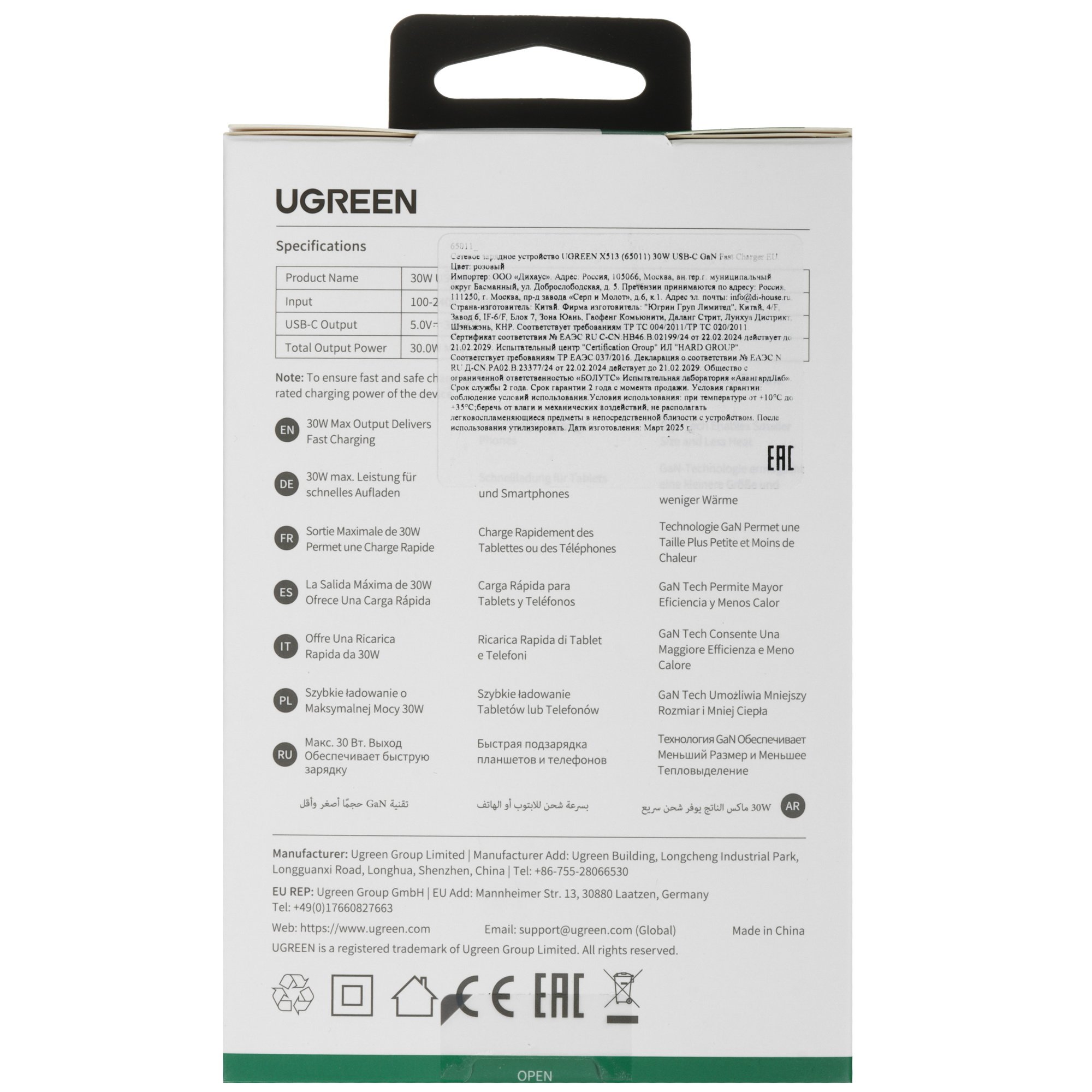 Сетевой адаптер Ugreen X513 выполнен в розовом пластиковом корпусе. Технология GaN повышает энергоэффективность при сниженном тепловыделении. Система защиты от перегрузки, перенапряжения и короткого замыкания гарантирует стабильный процесс зарядки подключенной техники.