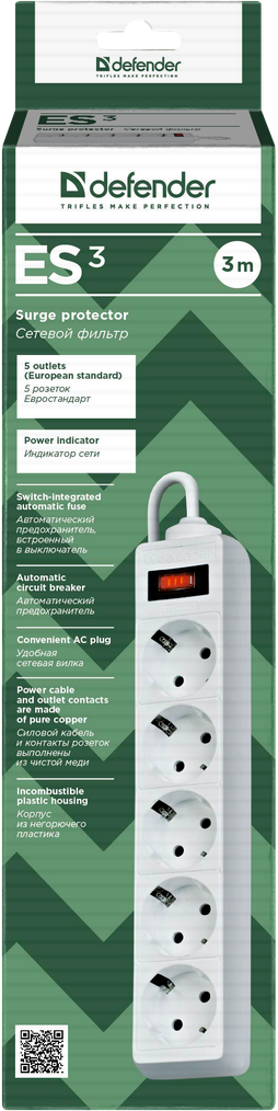 Defender ES – это не только разветвитель и удлинитель, но еще и надежная защита от импульсных помех. В случае возникновения опасных перегрузок или короткого замыкания автоматический предохранитель отключает подачу электричества, предупреждая повреждение подключенных приборов. Все проводящие элементы выполнены из меди, для других деталей используется негорючий пластик.