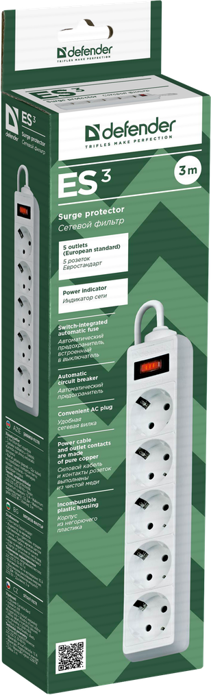 Сетевой фильтр Defender ES с трехметровым кабелем оборудован проводящими элементами из чистой меди. Для изоляции использован несгораемый пластик. Есть защита от импульсных помех, перегрузки и короткого замыкания. В критической ситуации срабатывает автоматический предохранитель, отключающий все розетки.