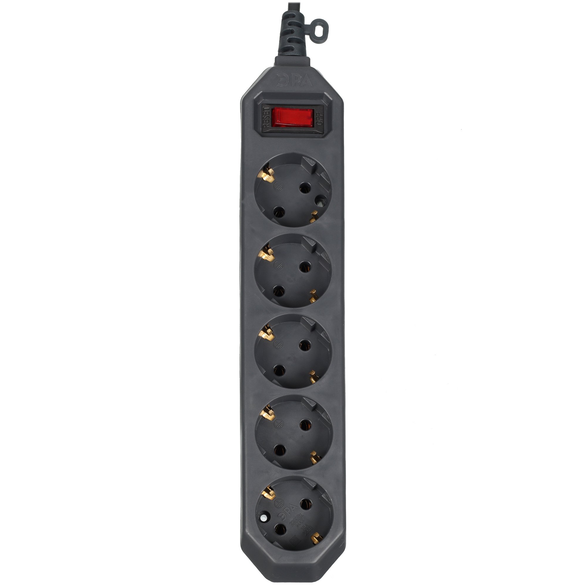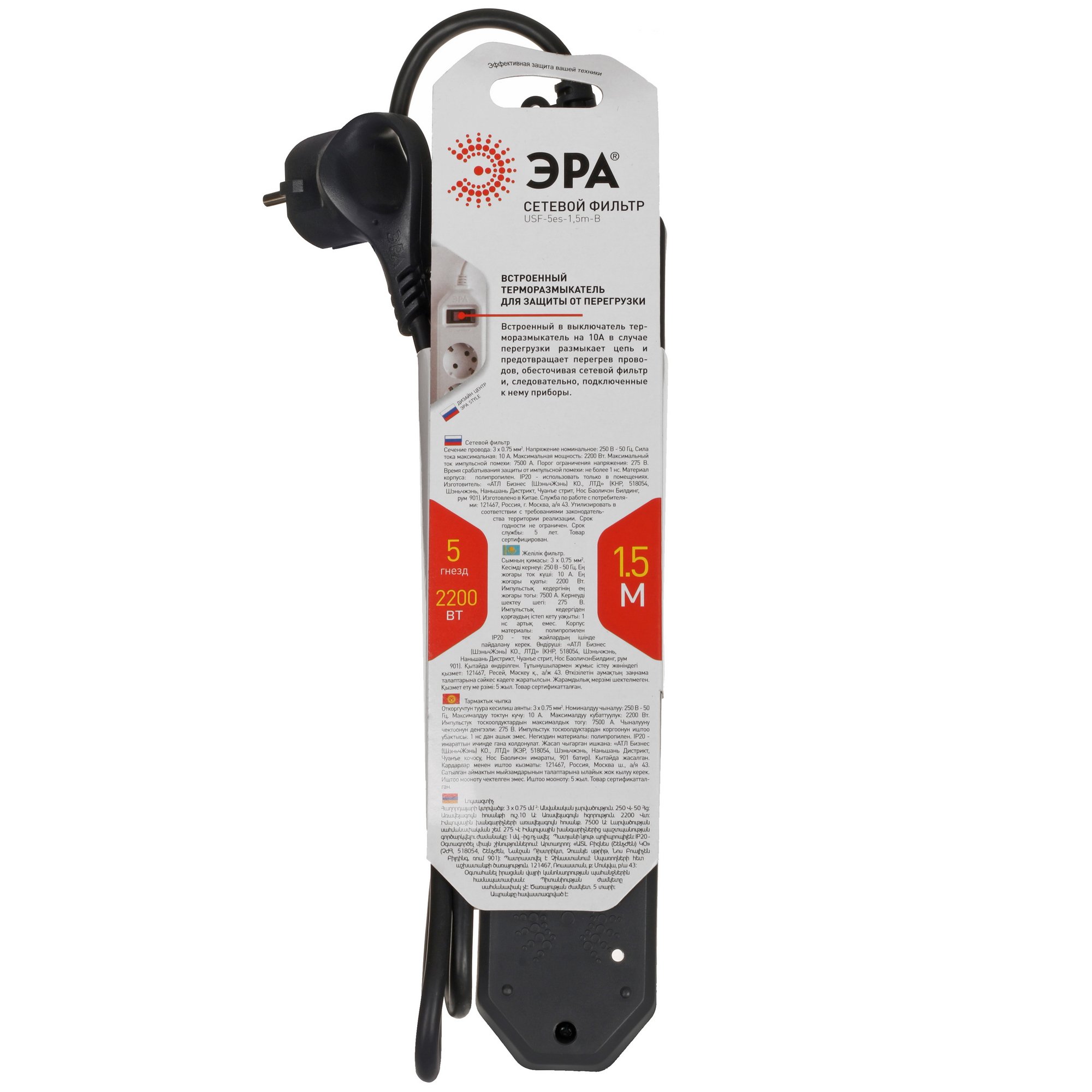 Сетевой фильтр ЭРА USF-5es-1.5m-B оснащен 5 розетками с заземляющими контактами. Суммарная мощность нагрузки не должна превышать 2200 Вт. Розетки включаются и выключаются общим выключателем. Световой индикатор работы встроен в кнопку питания. Длина шнура питания 1.5 м достаточна для удобного подключения к сети в большинстве случаев. Устройство имеет практичный черный цвет. Дополнительное преимущество сетевого фильтра – компактность.