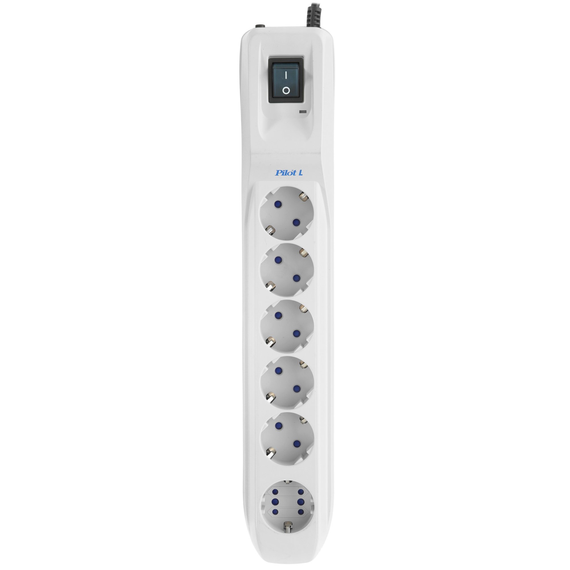 Сетевой фильтр Pilot L в белом пластиковом корпусе обеспечивает защиту от перегрузок, коротких замыканий, грозовых разрядов и помех в электросети. Он имеет 6 розеток типов GP, C, F с заземлением и рассчитан на нагрузку до 2200 Вт. Pilot L также оснащен общей кнопкой включения/выключения для удобства использования.