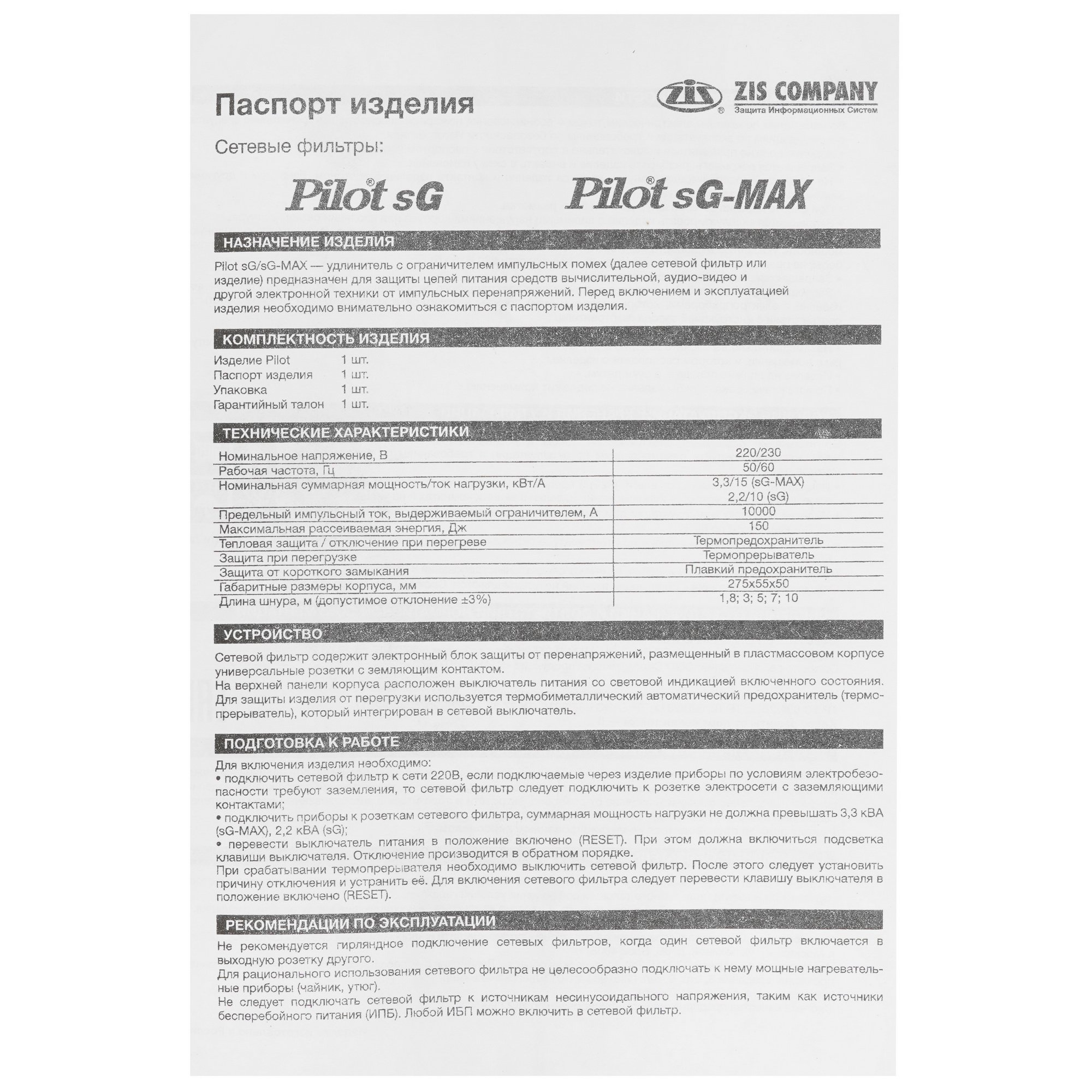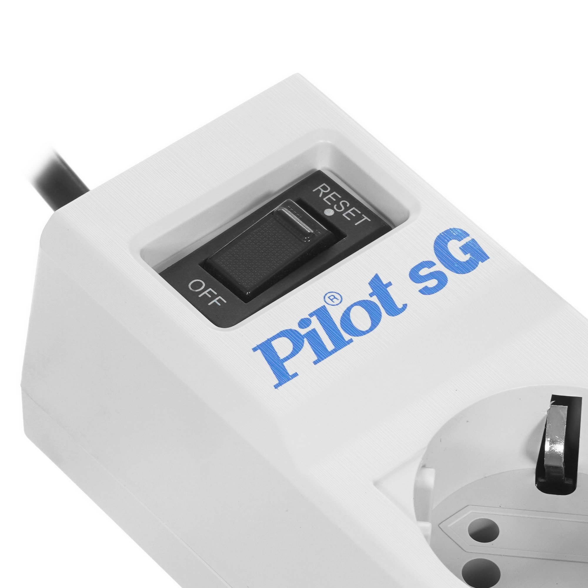 Сетевой фильтр Pilot sG выполнен в компактном корпусе из прочного трудногорючего пластика, при этом контактные шины изготовлены из гибкого металла, благодаря которому обеспечивается плотный контакт с вилкой, что обеспечивает надежное и удобное подключение. Устройство может фиксироваться на стене. На лицевой стороне сетевого фильтра расположен общий выключатель, а также индикатор работы. Длина кабеля питания составляет 3 м.
