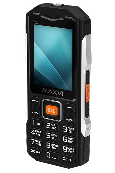 Mобильный телефон с диагональю экрана 2,4”, усиленными боковыми металлическими вставками и ёмким аккумулятором 2000 mAh. Maxvi T20 оснащён функцией Powerbank, позволяющей превратить телефон в источник энергии для других устройств. Данный аппарат разработан с учётом требований 76-ФЗ для военнослужащих ВС РФ (отсутствие доступа в Интернет, дополнительного флеш-накопителя, фотокамеры, диктофона, Bluetooth, MMS).