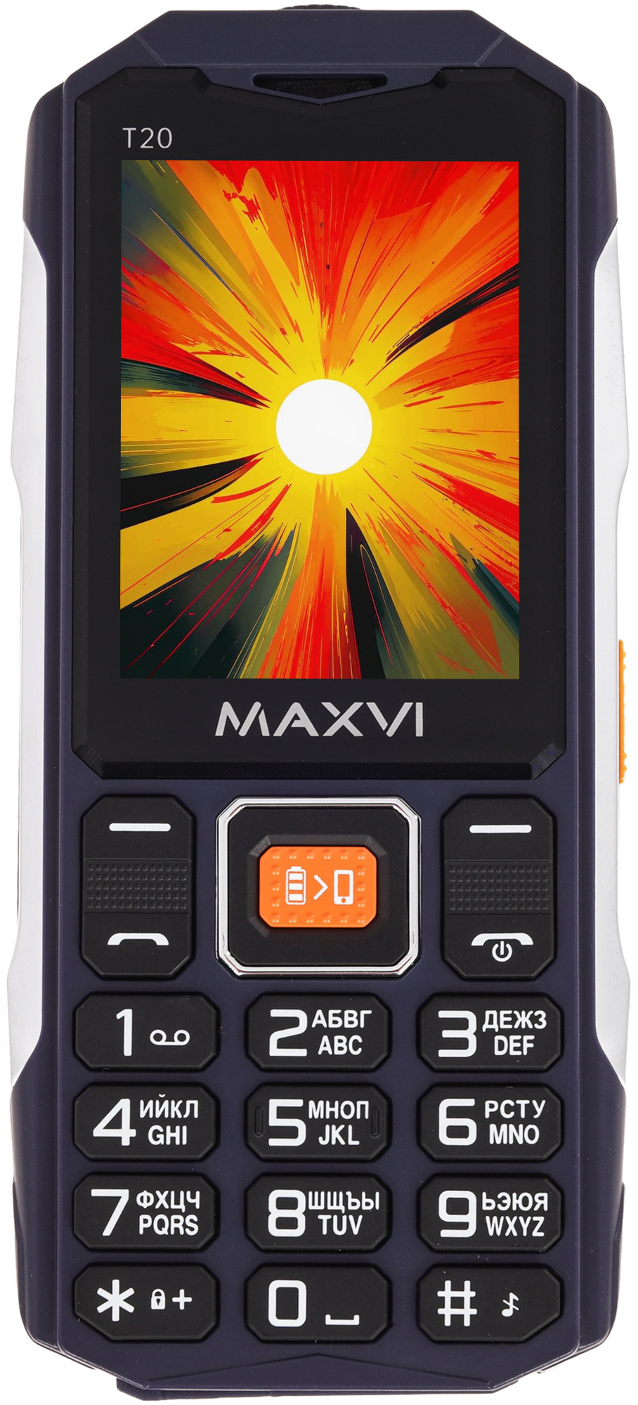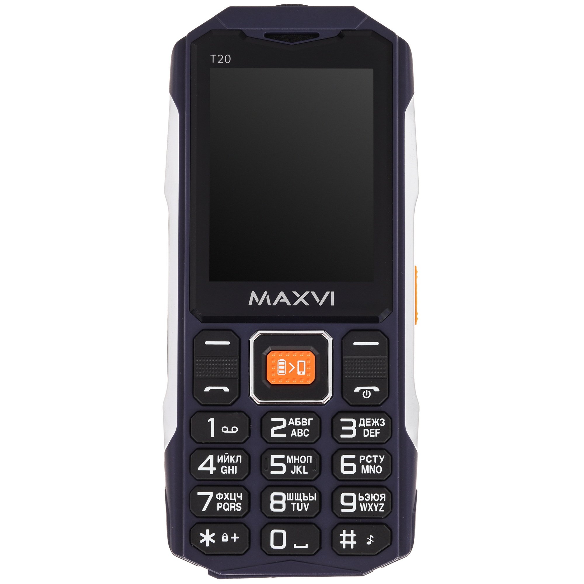 Mобильный телефон с диагональю экрана 2,4”, усиленными боковыми металлическими вставками и ёмким аккумулятором 2000 mAh. Maxvi T20 оснащён функцией Powerbank, позволяющей превратить телефон в источник энергии для других устройств. Данный аппарат разработан с учётом требований 76-ФЗ для военнослужащих ВС РФ (отсутствие доступа в Интернет, дополнительного флеш-накопителя, фотокамеры, диктофона, Bluetooth, MMS).