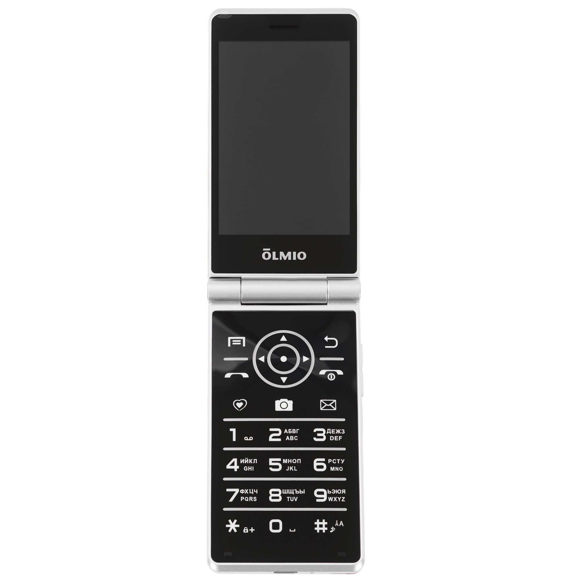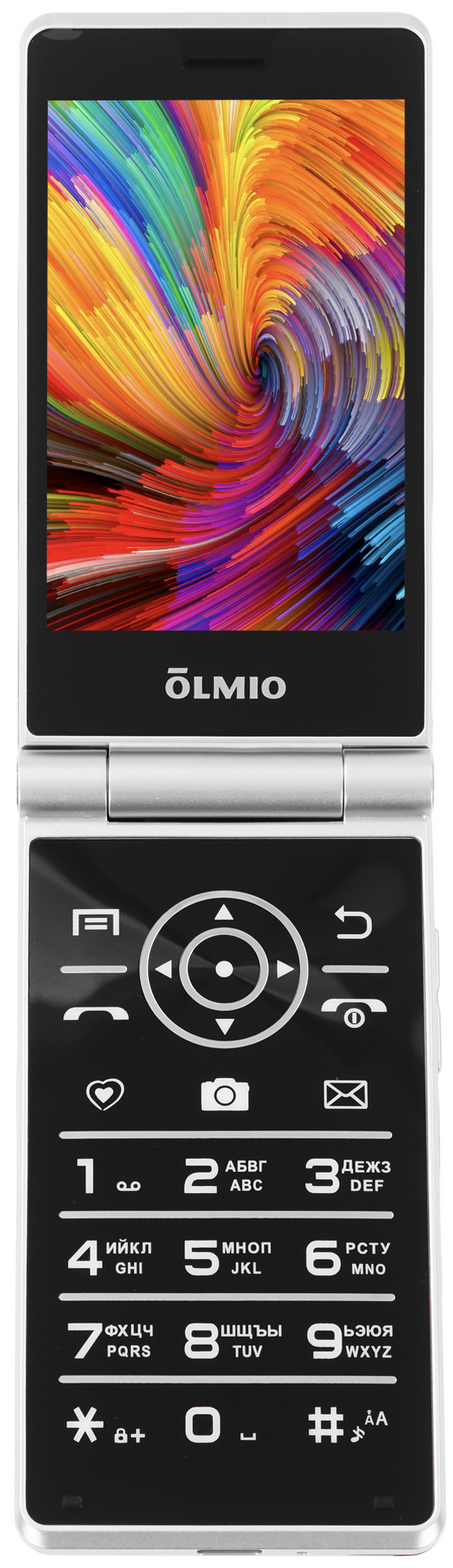 Сотовый телефон Olmio F50 в форме раскладушки имеет основной дисплей диагональю 3.5-дюймов. Положенная в основу IPS матрица обеспечивает отображение насыщенных цветов. Конструкцией пластикового корпуса красного, серебристого, черного оттенков предусмотрен слот для карты памяти объемом до 64 ГБ. Встроенный видеоплеер воспроизводит файлы в MP4-формате.