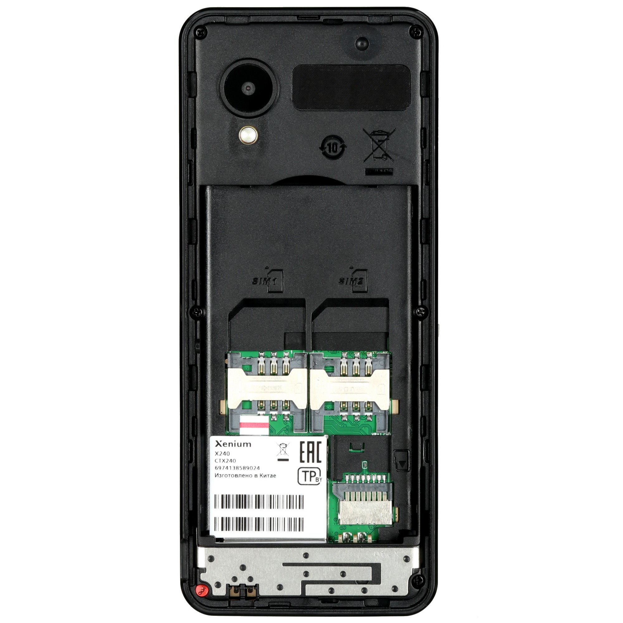 Сотовый телефон Xenium X240 оснащен цветным 2.4-дюймовым экраном TFT с разрешением 320x240 пикселей. Он передает четкую и красочную картинку. Под экраном расположен клавиатурный блок с кнопками управления. В устройстве есть слоты для установки 2 карт сотовых операторов формата Mini-SIM. Они работают в режиме ожидания.