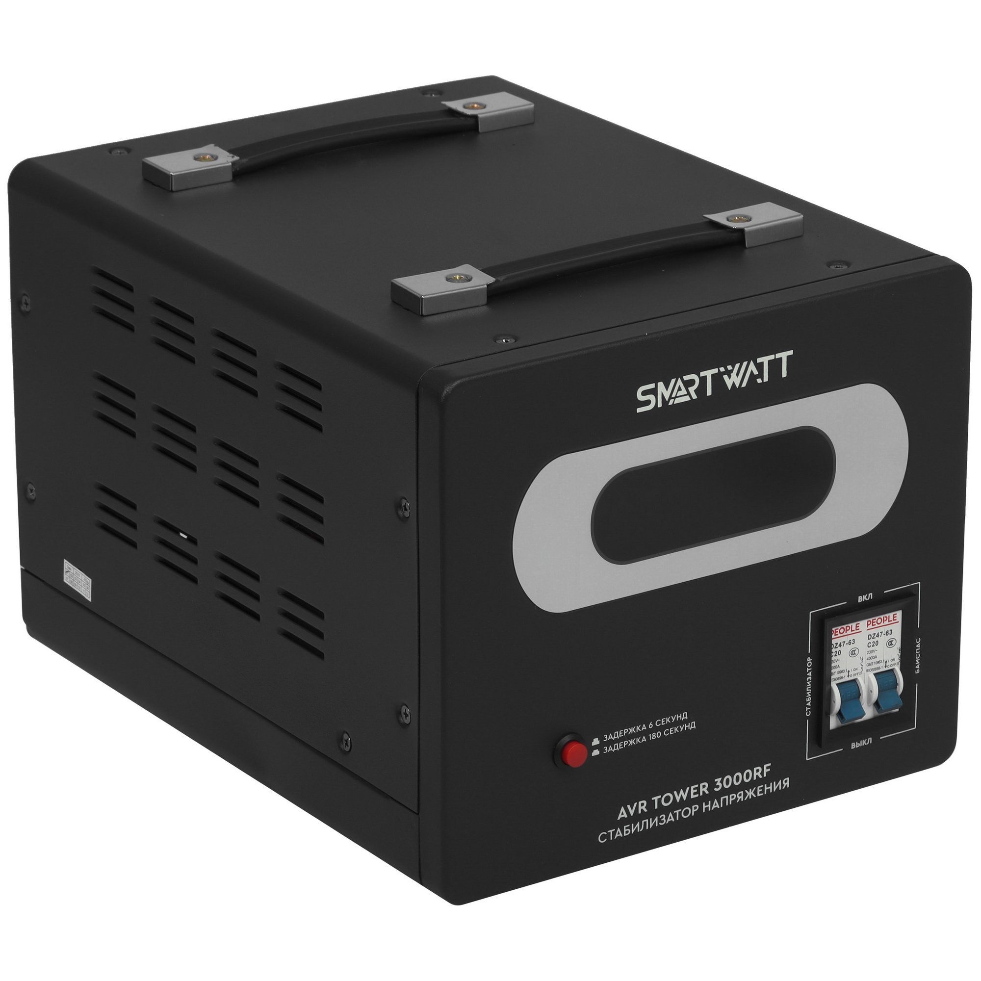 Механизм байпас предусматривает переключение электропитания нагрузки на входную сеть в обход электронной схемы стабилизатора при неполадках. Функция задержки запуска уберегает технику от резкой подачи напряжения после отключения электричества. Функция ZeroCross уменьшает помехи переключения при нулевом напряжении, снижает нагрузку на контакты реле и продлевает срок их службы. Система охлаждения с вентилятором эффективно рассеивает тепло. Для визуального контроля параметров напряжения на передней панели установлен ЖК-дисплей. С помощью ручки удобно переносить стабилизатор SMARTWATT AVR TOWER 3000RF.